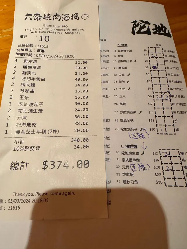 估唔到第一次寫食評係因為伏到喊🥹我地淨係叫咗陀地燒,埋單總共11樣嘢食,上枱嘅時候已經係“常溫”,完全唔熱,都冇話手機食先🫠,仲要等咗好耐🍖肉好普通,招牌牛肉串好硬,燒豬頸肉串唔係好新鮮,孜然燒雞翅OK🌽好食嘅淨係得粟米,翠玉瓜同菠蘿🫥🪀陀地燒茄子個皮好硬,上面蒜料同元貝一樣,小辣有啲咸;元貝OK如果嘢食普通其實都算,一班人食嘢傾下計都好,但比我食到有釘書機啲釘??!究竟係點出錯先會係有呢啲嘢係翠玉瓜入面?🫠(唔係表面🫥)好啦叫人黎處理,佢話換過份,冇問題,我地都好爽快,個陣覺得佢即刻換咁就算,冇即時影到相但佢換到我地就埋單先黎,仲要啲服務態度超差🙄🔥(去到後面已經唔想再叫人黎睇啲鐵,一陣比人以為我地奧客)食物嘅部分真係伏到冇咩好講,單講嘢食落單就係咁出錯,第一次落單之後我地有加單,然後又要等十世第1️⃣張單佢地落漏咗個牛舌然後加單之後,第2️⃣張單,佢落多咗啲我地冇叫嘅嘢,但都係冇牛舌第3️⃣張單出後del咗啲嘢,然後都係冇牛舌啱啱上嘢食個陣還好,啲嘢食分開上都可以理解但後尾過程中,等超過15分鐘都未有嘢上,叫人同佢講落錯單,等好耐都冇人應(啲員工一係企哂係門口,一係玩手機,好似得2個係忙緊送餐)終於叫到員工黎,結果嘢都未講完佢就走咗(隔離枱等咗差唔多7個字,叫人黎問先知員工未幫佢地落單🤡🤡)等終於有嘢上嘅時候,佢又上錯冇叫嘅嘢黎咗,叫咗嘅冇黎等到最後個男嘅員工黑口黑面黎叫我地埋單🫠🔥,我地都想走,幾驚佢郁手啊但張單上面加叫嘅豬頸肉無黎,牛舌就一直冇出現係張單到🤡🤡🍖(問號)最後佢地del咗個豬頸肉,叫我地埋單仲要語氣好差從頭到尾,佢地食物出事🍖🪀,出餐慢,落錯單,出錯單,上錯菜,一句Sorry 都冇,仲要態度惡劣真係4百幾蚊比錢買難受食到上火🔥查看更多