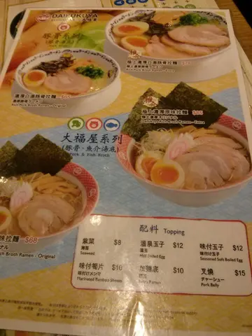 店名:大福屋拉面地址:中环阁麟街32-34号美轮楼地下C号舖好味指数:7.5/10价钱:$20辣油豆腐这个冷盘辣油豆腐质地非常软滑,豆腐面头布满一堆香脆的辣油,充满麻油香味,愈吃愈滋味。店名:大福屋拉面地址:中环阁麟街32-34号美轮楼地下C号舖好味指数:7/10价钱:$85极上浓厚原味拉面这个极上浓厚原味拉面比浓厚白汤好味得多。味道就有点像鱼介的味道,但味道却不太突出。选了普通面质,很快做腍掉。配料有豚肉,糖心蛋,竹笋,日本鱼蛋等。整体一般,没有相当突出之处,个人认为在味道和价钱相比下,确实不值。店名:大福屋拉面地址:中环阁麟街32-34号美轮楼地下C号舖好味指数:5/10价钱:$78极上浓厚白汤豚骨拉面极上浓厚白汤豚骨汤底味道非常清淡,好像吸没有味道一般。面质幼细,虽然选了硬的面质,但上枱后便浸软了。拉面配料有豚肉,笋丝,木耳,糖心蛋和葱花。糖心蛋味道不错,豚肉比较厚,不容易吃。 …查看更多