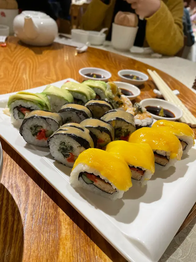 平日星期五訂了晚上七時半,一入餐廳已見到好多人正在用餐,好彩訂了枱。看看餐牌,好多野都想食,最後選擇了:🏮原盅黃耳素翅燉椰皇湯清甜好好飲,椰子味重,黃耳爽脆,椰子肉腍。🏮壽司拼盤賣相好靚,壽司卷好食,牛油果或芒果配搭嘅壽司好夾,好好味,口感好正!🏮蜜汁叉燒皇像真度好高,味道同口感都好似真叉燒。🏮芝士焗蒜蓉包賣相好吸引,增加食慾感,烘得恰當好處,外脆內軟,芝士味唔膩,好好味。🏮薑蓉炒翡翠苗翡翠苗好嫩,新鮮。🏮香椿瑤柱魚翅蛋白炒飯炒飯炒得乾身,粒粒分明,味道亦唔會太咸,有香椿嘅香氣。🏮原隻鮮菠蘿咕嚕肉甜酸味做得好好,好開胃,‘啖啖肉’嘅感覺。🏮紅豆西米露糖水甜度係少甜,好合心意!好多款式嘅素食,食得好滿足、好豐富嘅一餐查看更多