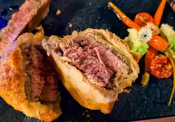 提前系大街餐厅食圣诞大餐。圣诞大餐加甜品,总价$446加一。前菜大虾带子及烟三文鱼,大虾新鲜,虾肉清甜。带子好味,上等食材。烟三文鱼微咸,开胃,好味。主菜焗酥皮牛及慢煮鸭胸。如果有睇摘星厨神Burnt。电影故事情节讲慢煮系要将食材放入胶袋,用热水慢煮。是次食材系鸭胸肉。厨师先用盐、胡椒、香草等调味料放入真空胶袋,再加入鸭胸肉。水温达60-62°C,慢煮 48-72小时。之后放上平底镬煎熟。过程复杂但可以保存鸭胸鲜甜味。我今次食到既鸭胸肉,肉质弹牙爽口。肉汁鲜甜。焗酥皮牛柳,做法系用干身既牛柳,外层包裹着酥皮。之后放入焗炉。要焗到酥皮呈金黄色,但内里牛柳肉质刚刚好七成至八成熟。单单睇这碟酥皮牛柳,酥皮呈金黄色,切开后再进食牛柳,肉质鲜甜嫩熟。焗酥皮牛柳配慢煮鸭胸肉,属高难度烹调美食。单单这道美食,本人认为已经到达米芝莲三星评级。最后个圣诞芭菲,卖相满分。上层是Parfait,糖霜加奶油,美味。下层系急冻红莓。红莓肉鲜甜美味。用最新鲜红莓肉。做法复杂,但传统既 Christmas Parfait 系两层。呢款甜品多数系大机构航空公司既头等机舱,食客会品尝得到。估唔到今日系大街餐厅,一次过品尝到咁多高水准美食。拍拖中既情侣或热恋中既夫妇,我诚意推介这款圣诞大餐。…查看更多