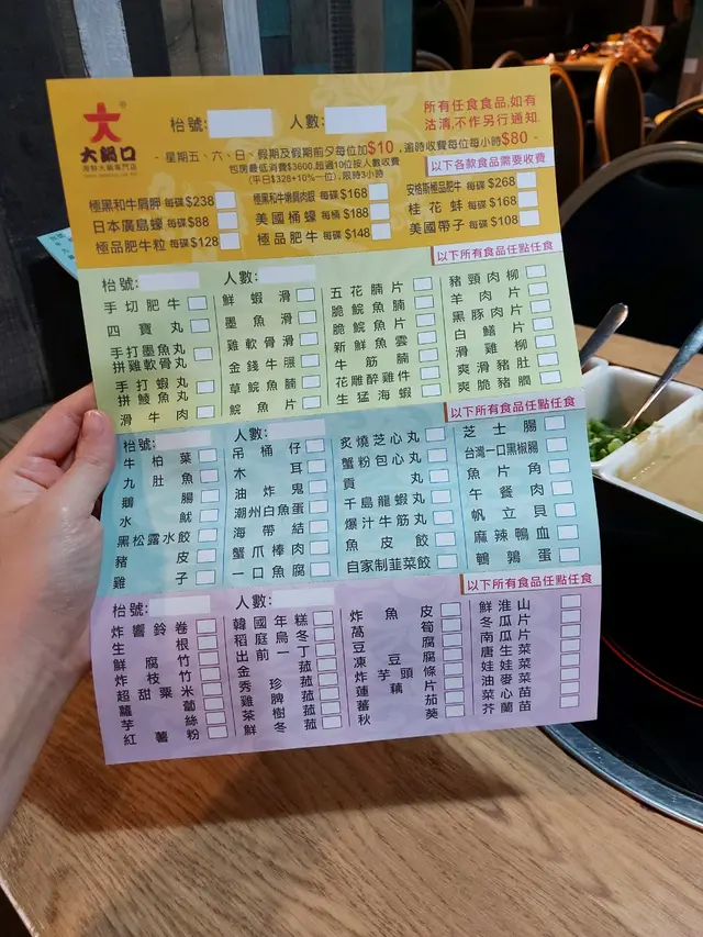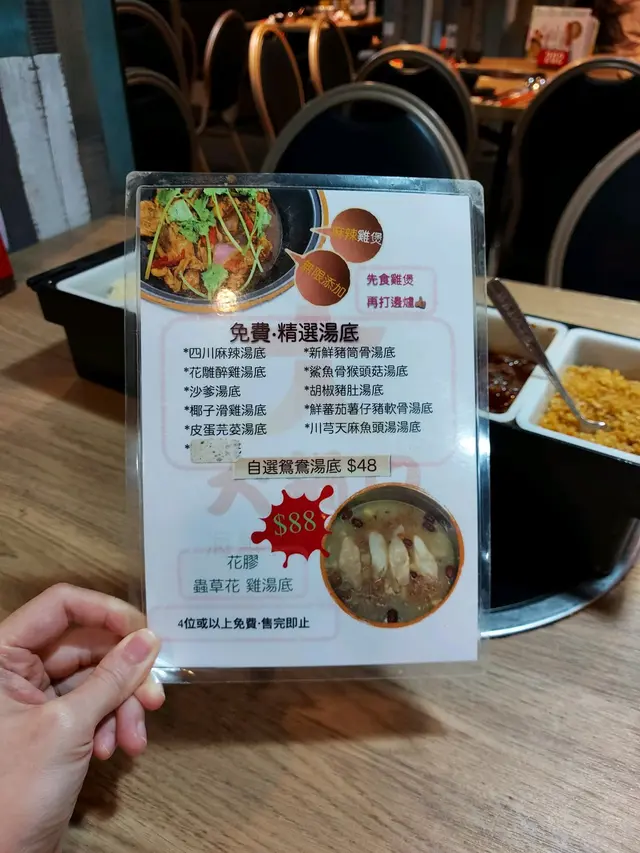 人气任点任食火锅,包括多款新鲜海鲜、肉类和蔬菜,麻辣鸡煲和手切肥牛是必试菜品,汤底选择丰富,如椰子滑鸡汤和沙爹汤底等,性价比极高。