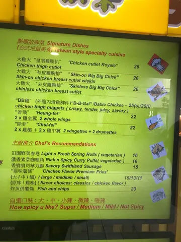 晚上十点多收工未食晚餐,大部分的食店都收得八八九九了。路过见到呢间大鸡大,求其买野医肚。点左一个BB鸡(外脆内软)<--佢写!点知黑过印度阿差!唔知系咪因为收工D油系水尾关系,一阵油溢味又干又硬呀!饮料方面更胜一层楼,点左杯巨峰提子多多。淡而无味清肠胃,见佢系水龙头度开水冲既,唔知D水系咪即开饮用水.....试饮左一口马上弃掉!大拿拿两样野加埋都成为43蚊,一次便足够!各位真系要小心中伏阿!…查看更多