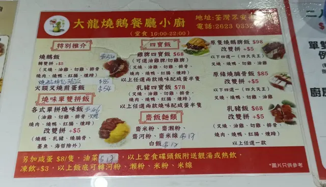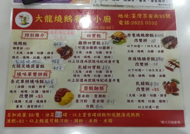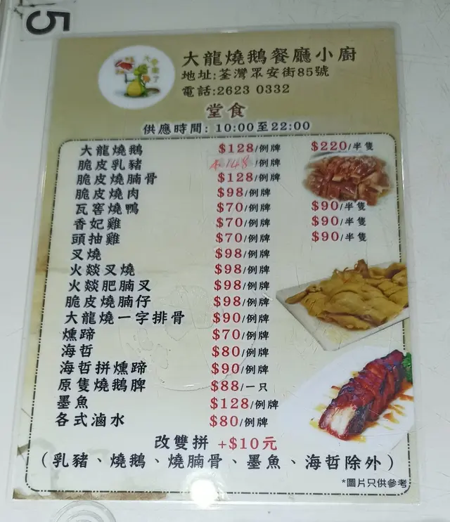 大龍燒鵝餐廳小廚 (荃湾) 网址: https://s.openrice.com/QrLS0gXiB00 地址: 香港荃灣眾安街85號地舖 电话: +852 26230332