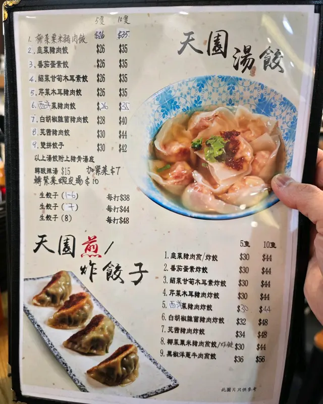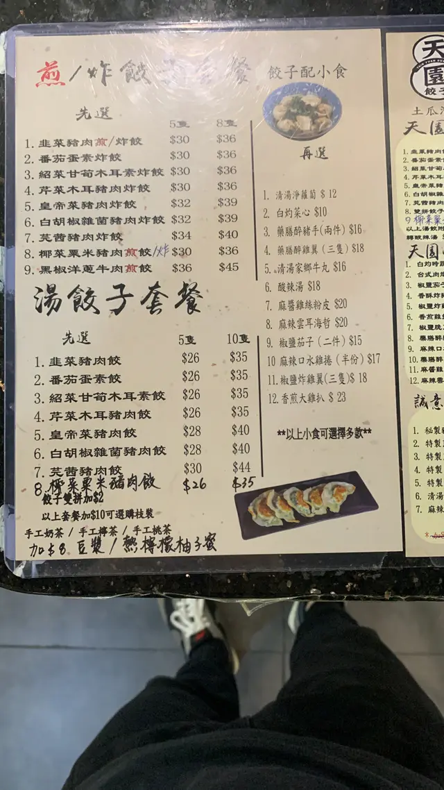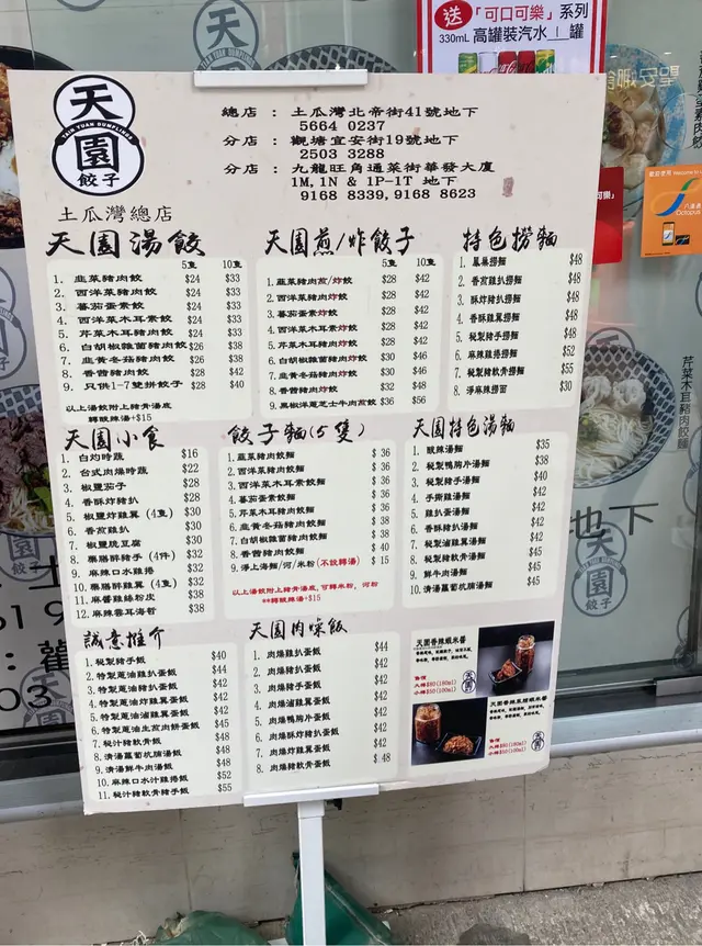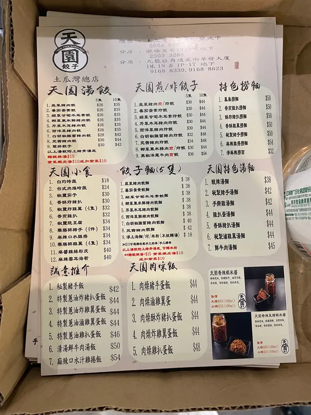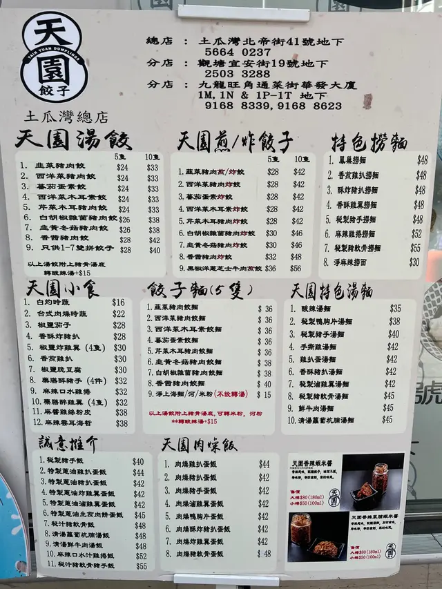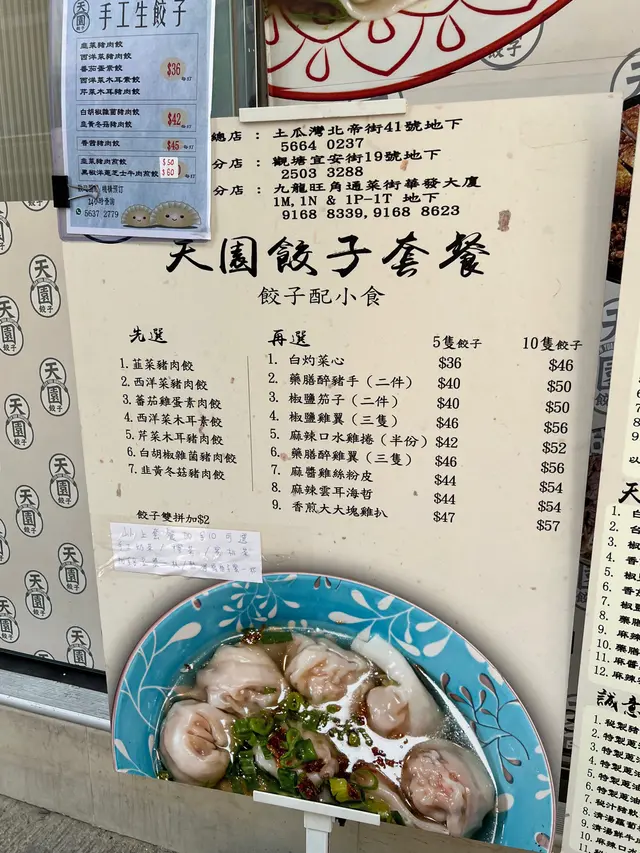 天園餃子 (土瓜湾) 网址: https://s.openrice.com/QrLS0j4OA00 地址: 香港土瓜灣北帝街41號地下B號舖 电话: +852 56640237