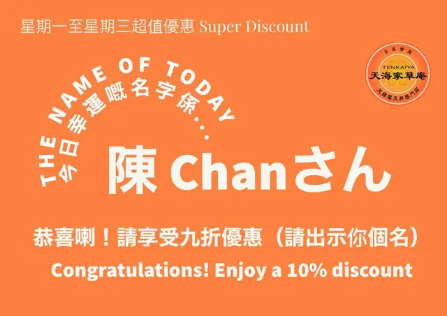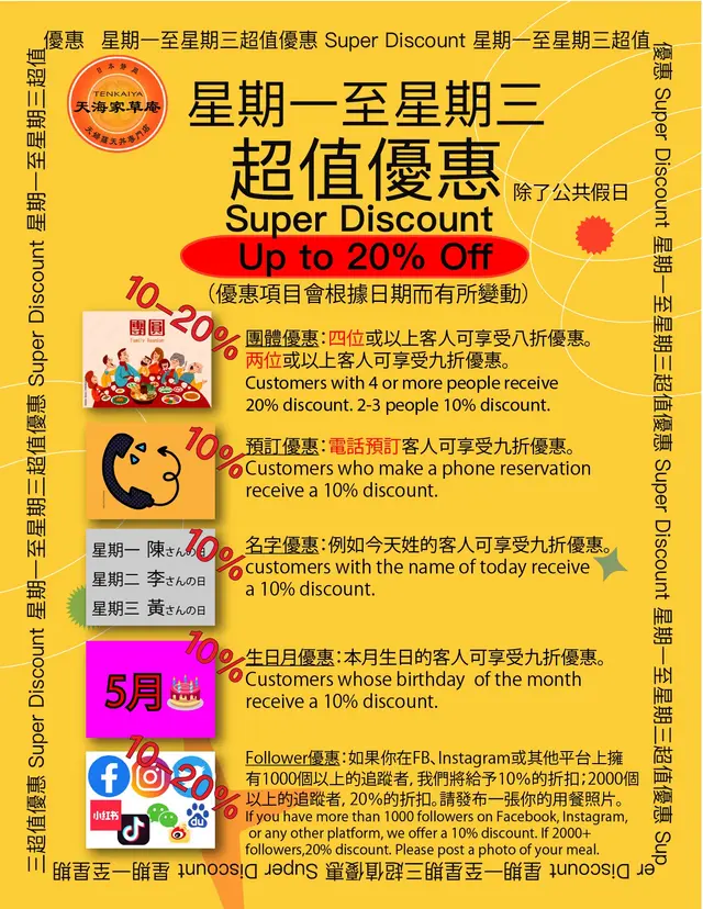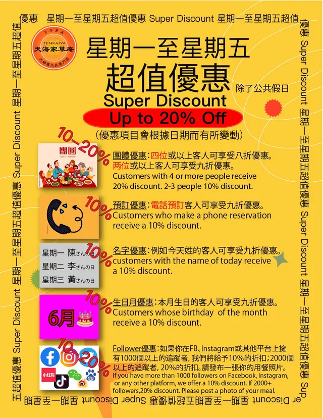今日星期一係陳先生嘅日子。以陳先生名字嘅客人可以有九折優惠!仲有其他唔同種類嘅折扣等緊你嚟呀。請嚟呢度啦! (由於好評,我們將活動延長至星期一至星期五! ) 今日水曜日は、陳さんの日です。陳さんのお名前のお客さまは10%割引き! 他にもいろんな割引を用意しています。ぜひおいでください。(好評につき、イベントを月曜日から金曜日まで延長しました!) #天海家草庵 #天海 #平价 #日本菜 #天婦羅 #價錢公道 #折扣