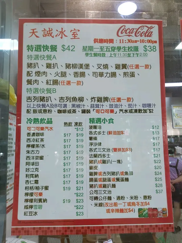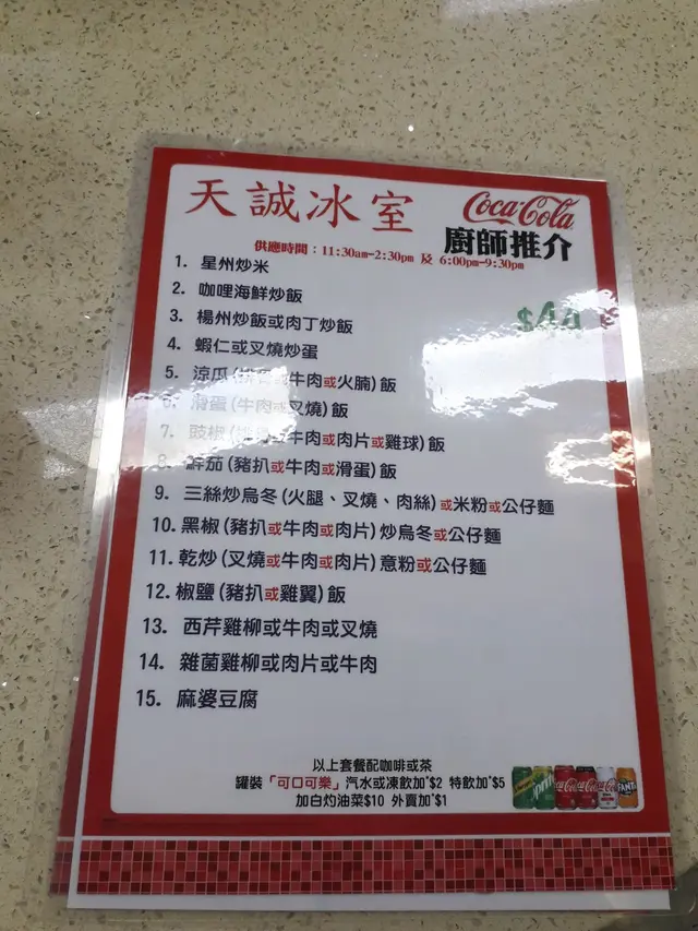 天誠冰室 (彩虹) 网址: https://s.openrice.com/QrLS0Xnm800 地址: 香港彩虹彩德村彩德商场5楼503号铺 电话: +852 28092219