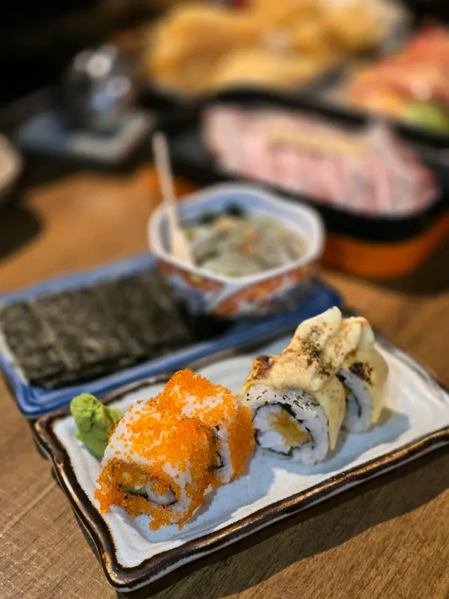 今日去咗呢間天鳥居酒屋🏮朋友係打邊爐控,見到出咗限時放題火鍋又去試下先!今次簡咗呢款五花腩豚肉套餐,可以任食豬五花豚肉,豬腩肉可以吸收湯汁的味道,口感軟滑!天鳥有好多款湯底,今之試咗壽喜燒湯底好濃郁香甜醬油味,配咗多款蔬菜仲有我最鐘意食QQ水晶粉我覺得呢個套餐最吸引係可以叫70幾款火鍋配菜同日式小食,當中最吸引當然係壽司!我試咗兩款❤️三重芝士大蝦反卷呢款反卷入面包咗大大隻炸大蝦為主料,外層鋪咗燒溶咗芝士,非常濃郁!加州卷加州卷外面撒滿蟹籽,入面有齊蟹柳、青瓜內餡,一啖食落去有齊幾種口感!炸物都係必叫,炸大蝦🍤炸雞火辣辣;多款wasabi八爪魚🐙辣味十足非常刺激📍天鳥居酒屋Tentori Izakaya天水圍天華路33號T Town North 2樓N212號舖查看更多