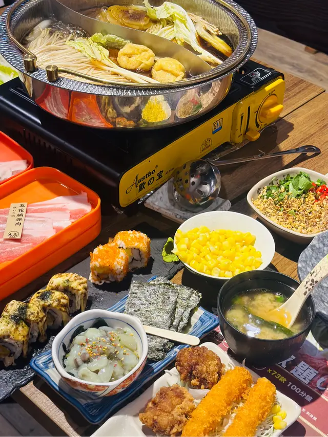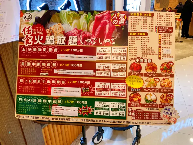 天水圍T Town 嘅天鳥居酒屋任食火鍋放題,性價比很高。我同朋友揀咗五花腩豚肉套餐,白豚肉眼真係好好依,肉質嘅味道肉味濃郁,肥瘦均勻保留到適中嘅油脂感外,仲咬到肉質嘅爽口。估唔再配壽喜燒湯底都會好夾好惹味。火鍋配料都應有盡有,蔬菜,丸類,豆品都任叫,滿足哂所有願望。日式壽司小食呢個都幾驚喜,而且每款都食得出用心製作,絕對不是湊個數嚟出品,同埋可以任叫真係超值,特別推介佢地嘅面豉湯,超鮮味嘅蠔味,我都飲左好幾碗,一定要試。另外仲有一堆啤酒汽水無糖茶可以可以任飲,大人小朋友都照顧到。查看更多