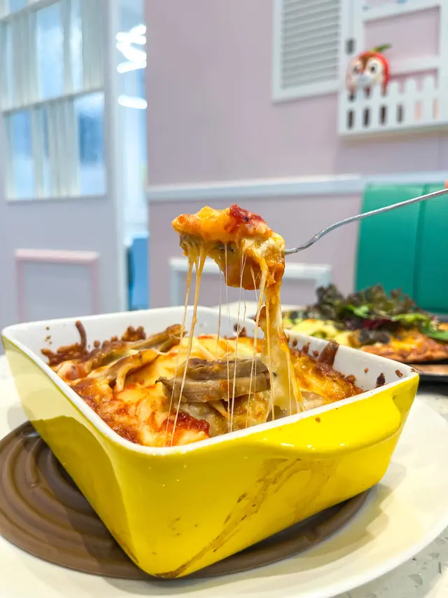 百靈菇青醬鮮豆包黑松露薯蓉焗千層闊麵