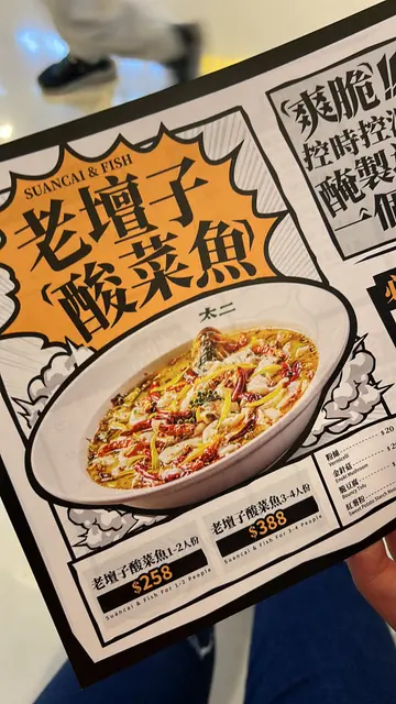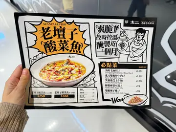 **太二酸菜鱼食评:酸菜鱼出色,服务贴心** 今次同屋企人去咗**太二酸菜鱼**食饭,整体体验几好,尤其系佢哋嘅招牌酸菜鱼,真系冇得输!另外,当日我哋带住初生BB,店员嘅安排同服务都令人觉得好周到,值得一赞。 **食物水准:酸菜鱼必试,炒鸡粒略嫌多骨** 1. **老坛子酸菜鱼**——酸辣鲜香,鱼肉嫩滑 酸菜鱼果然系招牌,汤底酸辣适中,唔会太呛喉,酸菜够爽脆,仲带少少甜味,好开胃。鱼片份量足,而且冇骨,肉质嫩滑,吸晒汤汁嘅精华,配埋白饭真系一流! 2. **辣炒鸡粒】——味道香口,但鸡骨稍多** 鸡粒炒得够镬气,辣椒同香料爆得好香,鸡肉都算嫩,不过略嫌有啲碎骨,食嘅时候要小心啲。如果可以用无骨鸡肉,口感会更加好。 **服务:对带BB嘅客人好体贴** 当日我哋推住BB车,店员主动安排咗宽敞嘅座位,仲帮忙摆好BB车,完全唔使担心阻住其他客人。用餐期间,店员都好细心,见我哋要照顾BB,上菜同收碟都特别轻手,完全冇催赶感,服务态度真系加分! **总结:会再帮衬,推荐酸菜鱼** 太二嘅酸菜鱼确实出色,汤底同鱼肉都做得好好,系必点之选。炒鸡粒味道唔错,但如果有无骨版本就更完美。另外,餐厅对带小朋友嘅家庭好友善,服务细心,整体用餐体验舒适,值得再嚟! **小建议**:如果炒鸡粒可以改用去骨鸡肉,食起嚟会更方便,尤其适合一家大细。