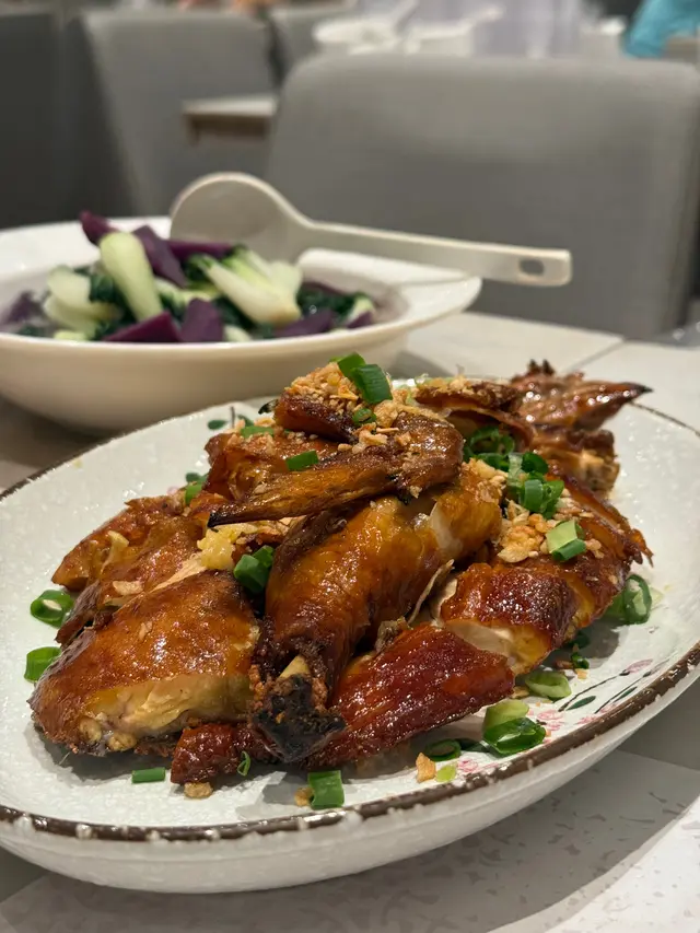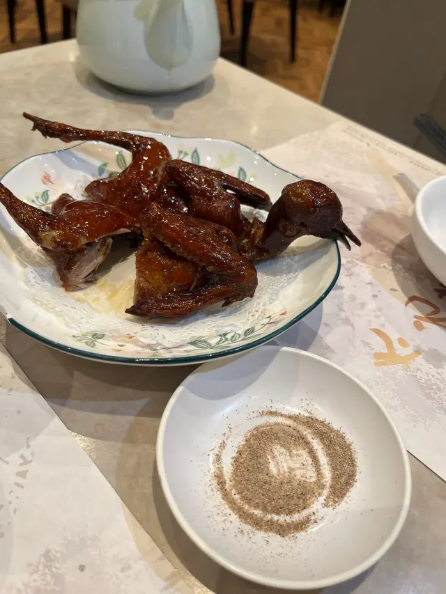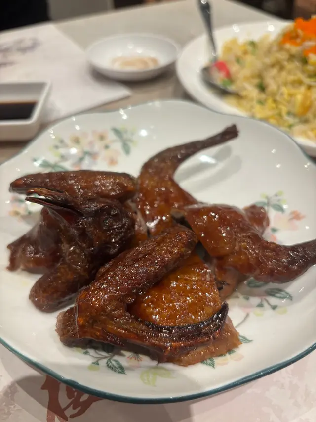 這個雞絲粉皮........ 1蚊你沒有看錯,是真的 1 蚊。太元樓每天都有一款特價菜式,晚市5:30後入座可享 + $1 加點一道美食﹗不要小看這個一元粉皮,份量是真的足。沒有將貨就價有別於常見的寬粉,它被切成一條條均匀的細條,質地柔韌又帶着几分Q彈,入口爽滑有勁。雞絲均匀地拌在粉皮中,肉質鮮嫩不嚡,併著同樣成絲的青瓜,軟中帶爽特別讚一讚那個切絲的手法~均勻幼細,我也很想學一手呢~ 妙齡乳鴿"妙齡" 這個名字很有年代感。新一代人估計也沒有多少人會用了 乳鴿因為價錢優惠, 所以只能堂食。每人限購一隻 我點了一隻,一開4,其實也有4份了。乳鴿的確是"妙齡", 不是那種中大鴿,外皮金黄油亮,散發着誘人的香气。肉質緊實却不嚡,滲滿了秘制滷汁的香味,咸香適中,讓人回味無窮,吃完後還忍不住舔舔手指。