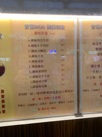 9点后宵夜时段...任饮时段...仲有1个套餐95折;2个套餐9折;价钱都吸引...咁就入左去....入到餐厅好多人都食铁板餐...安排坐卡位...好似窄左少少...于是要求转位 另一张卡位宽d...态度又Ok wor👍🏻拣左好耐都唔知拣咩好...Waiter又主动话我知另一本晚餐餐牌有图野食系点但宵夜份量会少D...两个人去各自叫一个铁板1+1餐...其实都唔少野.....都几大份....👍🏻👍🏻一份肉眼牛扒+ 龙脷柳...几好食㖞👍🏻牛又唔硬 唔错既👍🏻...鱼正常既..👌🏻一份ribs+鱿鱼筒Ribs 好大份....👍🏻👍🏻鱿鱼筒有雪味😓我系一个麻烦人唔够蒜蓉汁要求加汁 又要纸巾又要茄汁 又要饭匙 咁多要求 态度都好好👍🏻👍🏻👍🏻👍🏻我觉得罗宋汤几好饮👍🏻👍🏻朋友白汤话正常👌🏻蒜蓉汁好味👍🏻黑椒汁辣左少少👌🏻野饮任饮😂埋单每人$100都唔洗 超抵食👍🏻环境又唔差👍🏻可一可再👍🏻👍🏻…查看更多