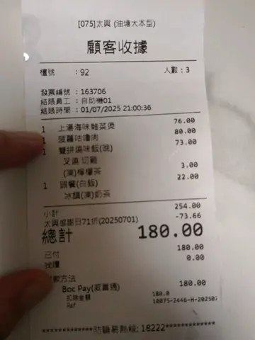 作为一个普通打工仔, 不论是月头 或是 月尾,anytime 都手紧, 加上近年经济唔好,所以懂得花 比 花得起更为重要!由于太兴烧味有71折,所以去享用晚餐。虽然不少高贵的香港人都话太兴难食,不过我食完之后感觉都唔差。 原本想叫乳猪饭,不过最后一份乳猪比人叫了,只好叫切鸡叉烧饭! 今次叉烧质素算几好,肉质算淋,好过之前$35半斤外卖的质素,切鸡的味道都是正常。另外,我叫侍应姐姐比多一碟烧味豉油,淋上白饭之上,令这碟平平无奇变成咸香好食。另外点了菠萝咕噜肉 和 上汤杂菜煲, 基本上这2款小菜味道都唔错,上汤杂菜煲的份量都唔少!最后加一碗白饭,2杯冻饮,合共$180, 算是抵食!…查看更多