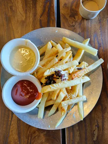入马湾探朋友,朋友推荐左呢间cafe 闲日下午人流唔多,所以可以坐好耐,食野,倾计,影相,cafe 仲有书可以睇可以手机📱scan code order / 行岀去柜枱点餐付款,先再入座有室外/室内坐,都算半自助形式,有需要可以自己斟水饮我们两人点一份蟹肉意粉、炸薯圈,咖啡渴力加(呢个味道好新颖,值得一试!
