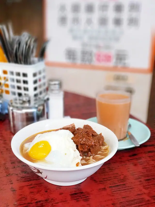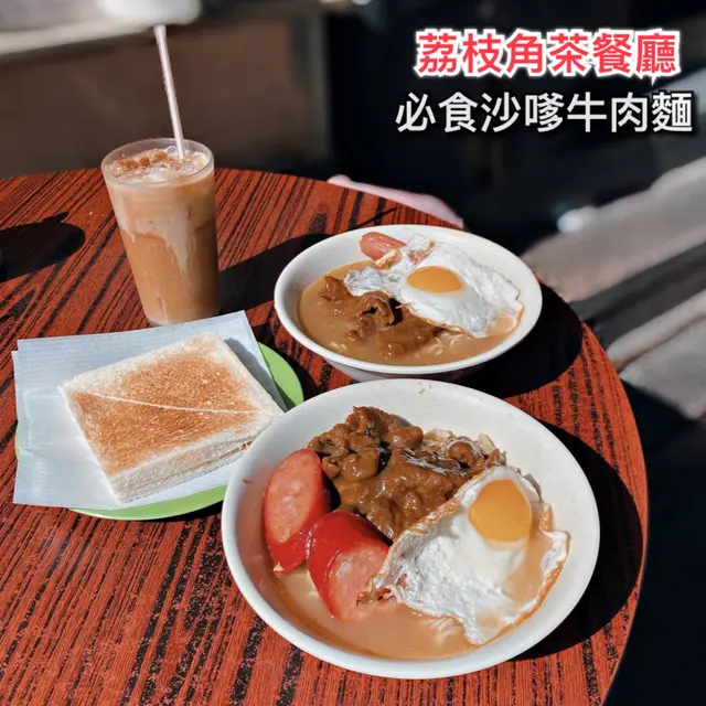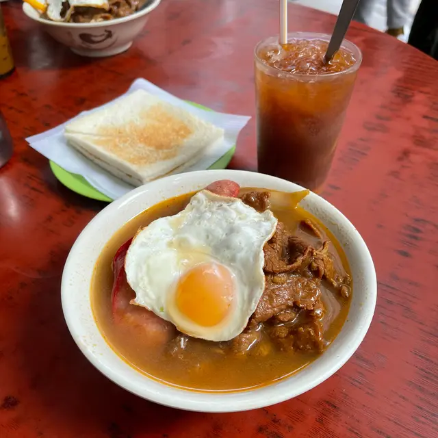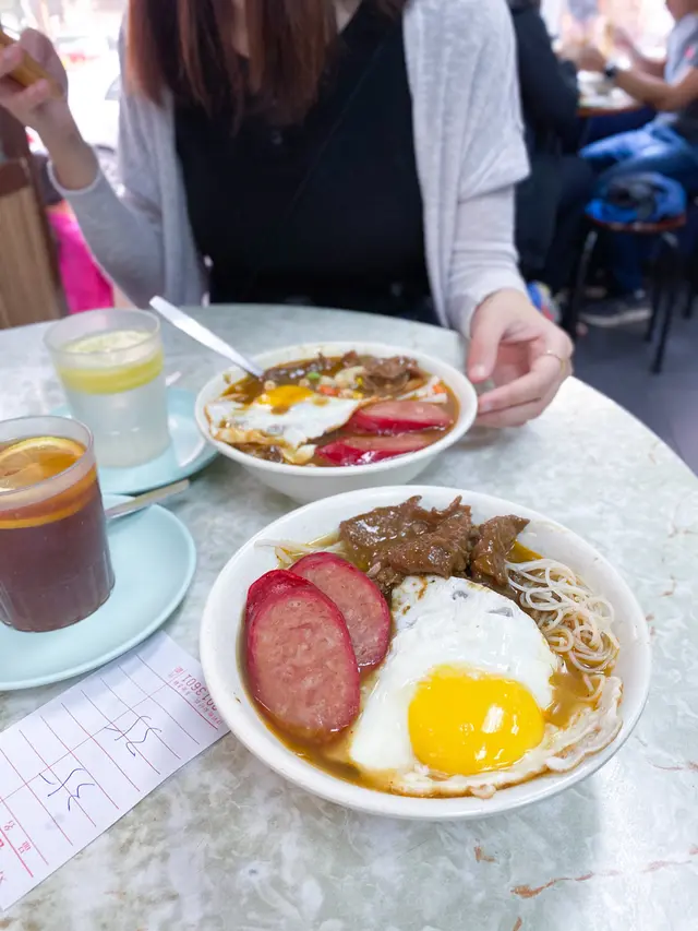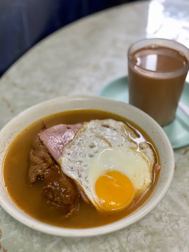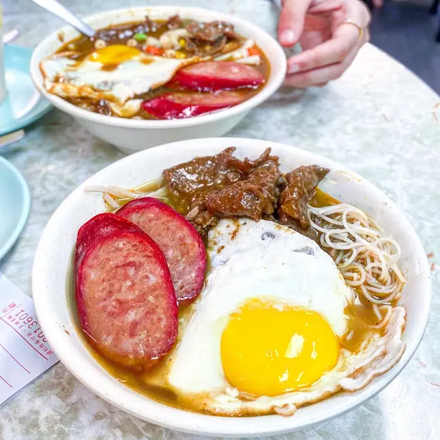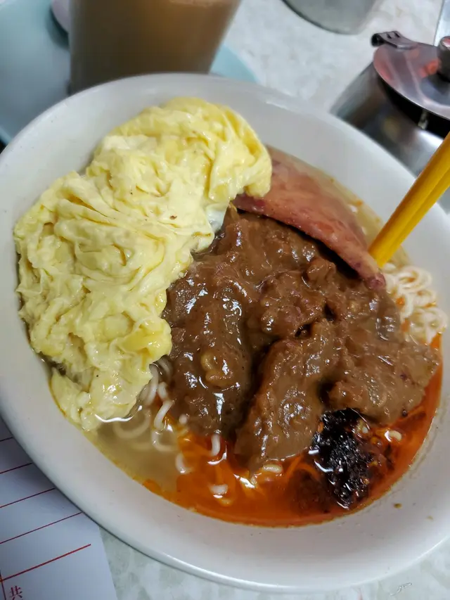 早餐上枱後即時呷一口湯,滿滿的沙嗲味,配上大光麵,掛湯十足 但略嫌欠缺花生味。牛肉大件嫩滑不柴,紅腸係煎的,加埋厚切值得加分