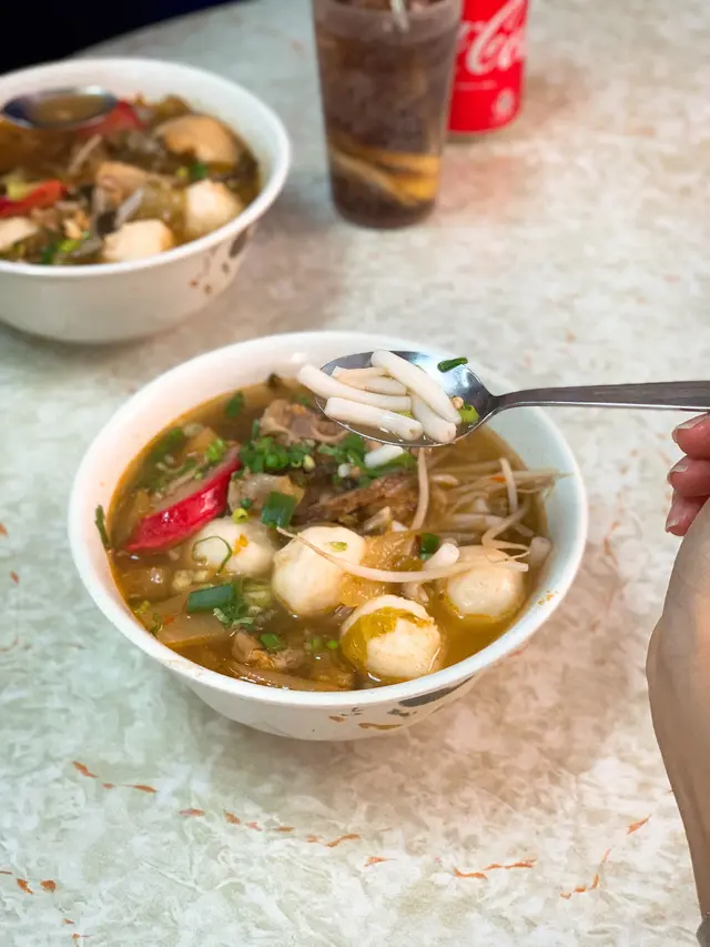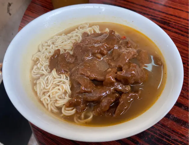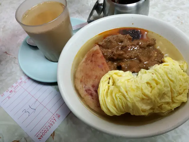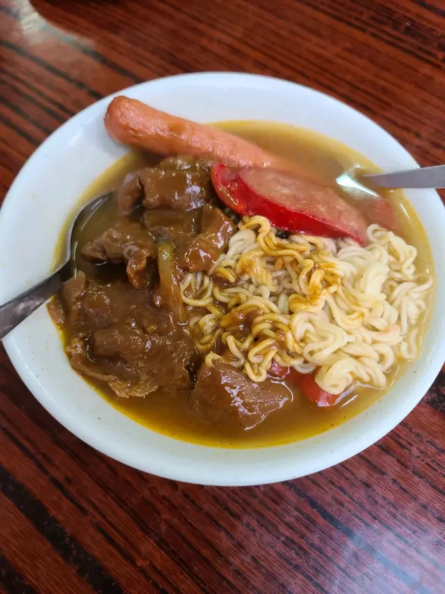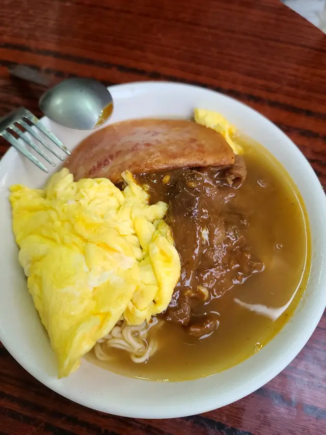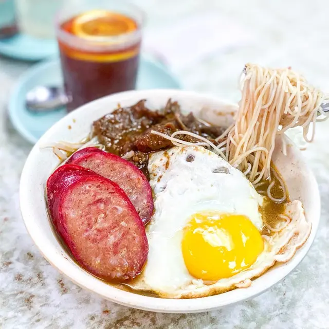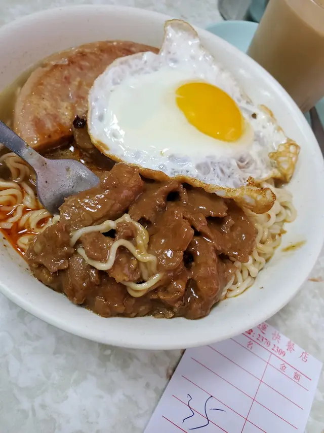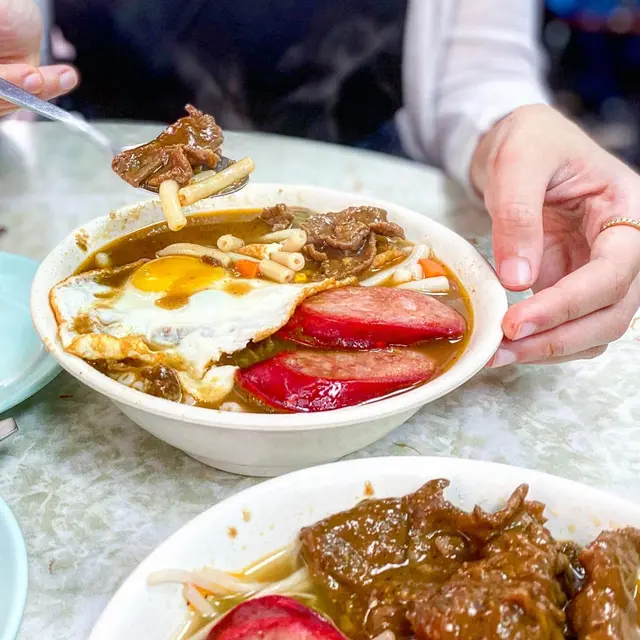 早餐上枱後即時呷一口湯,滿滿的沙嗲味,配上大光麵,掛湯十足 但略嫌欠缺花生味。牛肉大件嫩滑不柴,紅腸係煎的,加埋厚切值得加分