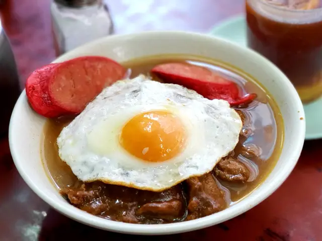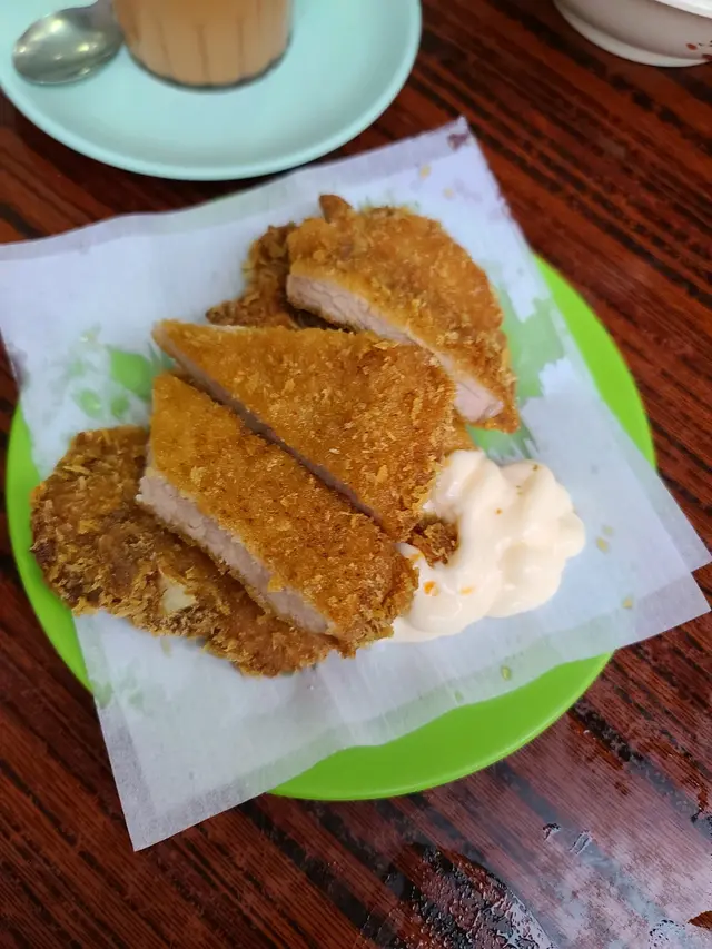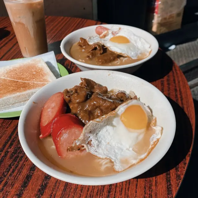 當日早上七點半已到舖經排隊,目測大約有二三十人,大約等咗一個鐘頭就可以入內進餐。點了紅腸煎蛋沙爹牛麵