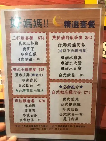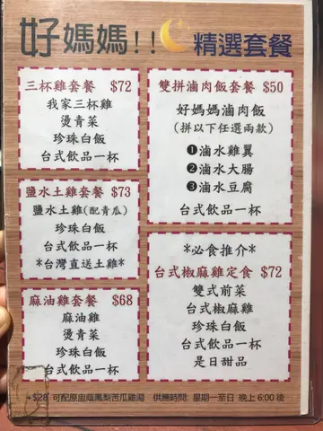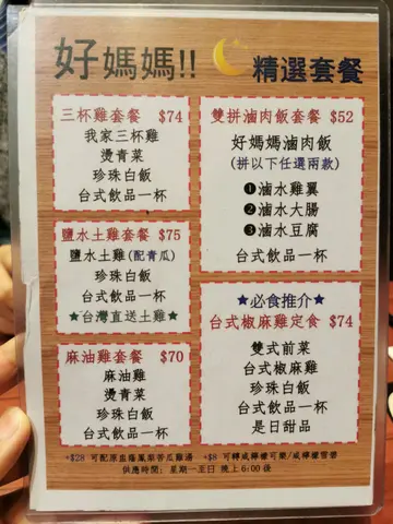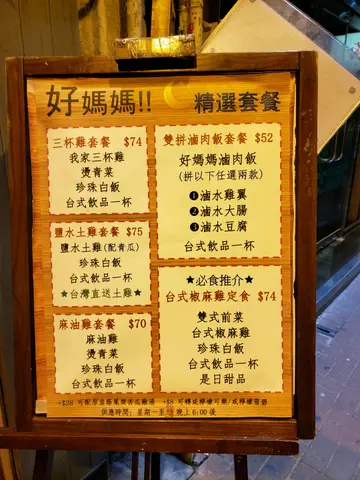 老婆无意经过这间台湾菜,入咗去试我本人在香港实在太少吃台湾菜 因为首先我唔系好钟意台湾菜我净系喜欢台湾小食但系老婆钟意就食啦铺面就细细,环境都几warm,卡位都几好坐见到佢咁劲台湾直送土鸡咁就当然要食呢个盐水土鸡套餐啦之后佢有个必食推介台式椒麻鸡定食,当然又要试埋啦土鸡配青瓜,都几系台湾嘅盐水鸡味会跟杯台式嘢饮嘅,不过啲咁嘅份量黎讲我就觉得有啲唔系好够饱 如果能够送多碗饭都好啲到我个椒麻鸡,我就觉得比较抵食先有两款唔知点解跟咗嘅日式小食两粒都唔知点形容嘅甜品但系好食嘅,麻薯feel椒麻鸡都非常之香,份量也足够大家个歺都系七十几蚊呢个餐抵食好多芋香珍珠同珍珠奶茶都好饮总括而言呢度啲食物质素不错分量方面,饭有啲不足当然我冇主动问佢可唔可以免费再加啦不过讲真呢一个位至十分之唔方便 而且佢都要七十零蚊个餐并不算便宜,会唔会返头食?都会有机会嘅 不过就唔会成日食啰真系好想好想食台湾嘢就会黎…查看更多