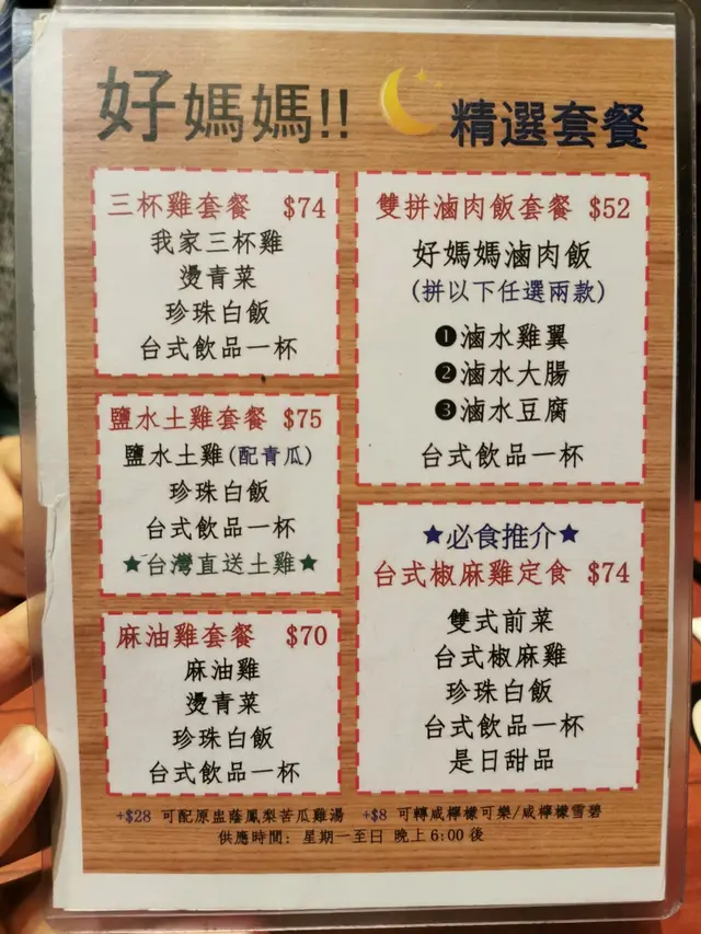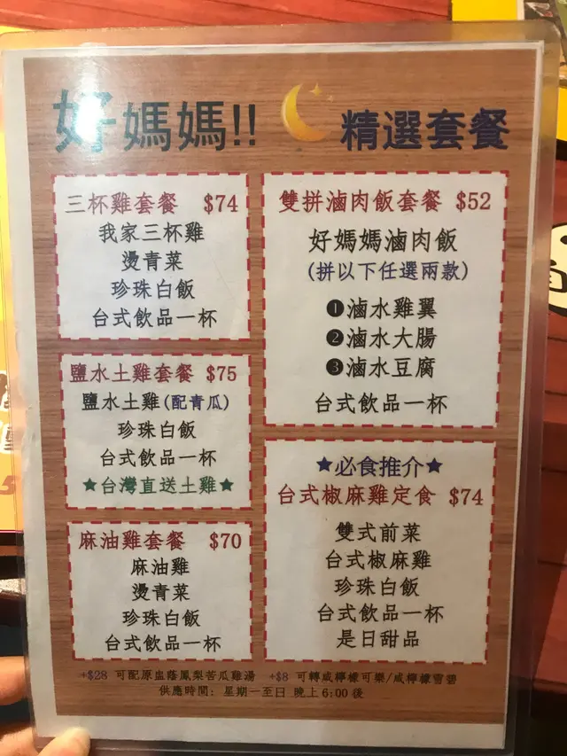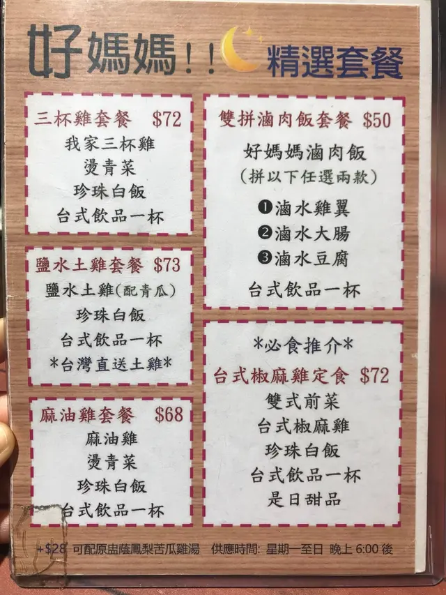 老婆無意經過這間台灣菜,入咗去試我本人在香港實在太少吃台灣菜 因為首先我唔係好鍾意台灣菜我淨係喜歡台灣小食但係老婆鍾意就食啦鋪面就細細,環境都幾warm,卡位都幾好坐見到佢咁勁台灣直送土雞咁就當然要食呢個鹽水土雞套餐啦之後佢有個必食推介台式椒麻雞定食,當然又要試埋啦土雞配青瓜,都幾係台灣嘅鹽水雞味會跟杯台式嘢飲嘅,不過啲咁嘅份量黎講我就覺得有啲唔係好夠飽 如果能夠送多碗飯都好啲到我個椒麻雞,我就覺得比較抵食先有兩款唔知點解跟咗嘅日式小食兩粒都唔知點形容嘅甜品但係好食嘅,麻薯feel椒麻雞都非常之香,份量也足夠大家個歺都係七十幾蚊呢個餐抵食好多芋香珍珠同珍珠奶茶都好飲總括而言呢度啲食物質素不錯分量方面,飯有啲不足當然我冇主動問佢可唔可以免費再加啦不過講真呢一個位至十分之唔方便 而且佢都要七十零蚊個餐並不算便宜,會唔會返頭食?都會有機會嘅 不過就唔會成日食囉真係好想好想食台灣嘢就會黎…查看更多