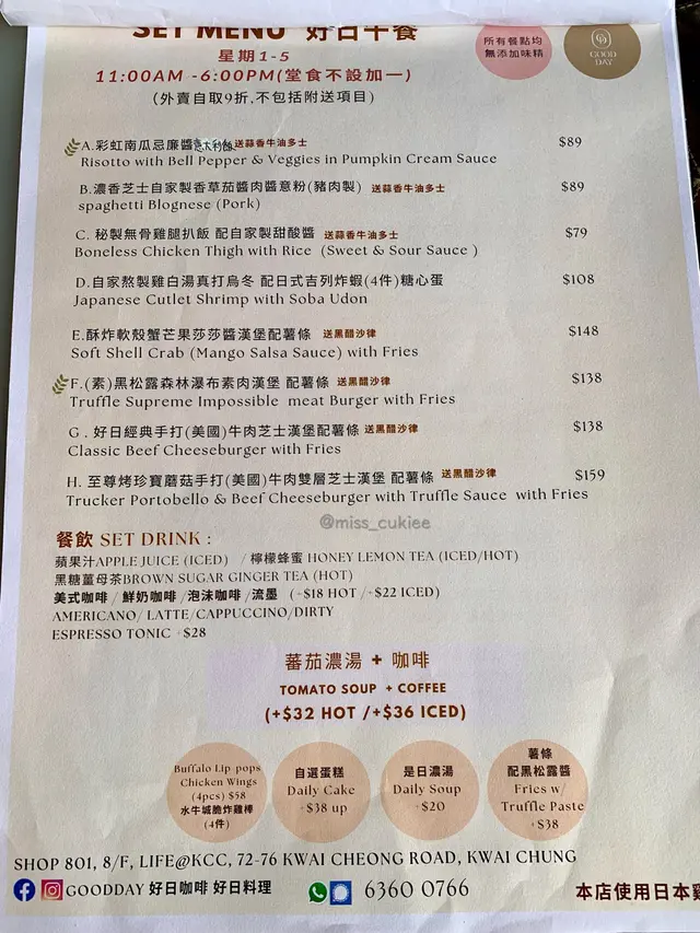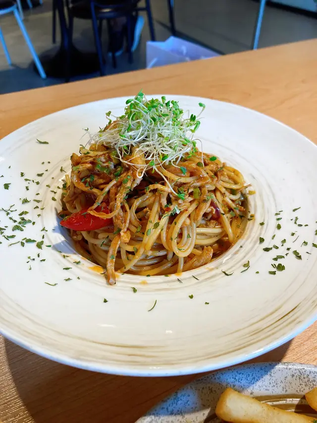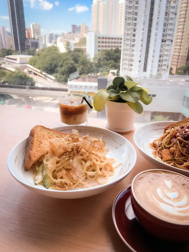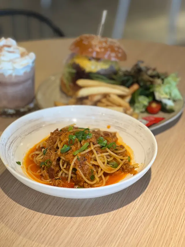 周末係葵興上興趣班,想近近地搵間餐飯食飯,其實kcc 都有幾間餐廳,見人推介呢間係平民黃店餐cafe就去試下。環境: 有分窗邊似indoor, 同counter 似open area, 窗邊只有單人枱, 最後揀左張大枱坐。🍔特調花生醬爽瓜瓜芝士牛肉漢堡 加左花生醬嘅甜漢堡令個青瓜顯得特別fresh,脆爽嘅口感令個漢堡好有層次。🍝花麻椒蕃茄手撕豬肉意粉 個人好鐘意花椒辣, 個意粉唔算好辣, 加埋蕃茄酸酸地幾好食, 不過手撕豬肉就唔夠滑, 肉同意粉份量各半, 意粉都唔錯。Set drink 我地加錢試左其他特飲🍫73% 特濃朱古力 $54-$10凍飲黎講個杯比較細, 上面個cream 唧得幾靚,好似朵玫瑰花, 下面個朱古力係暖嘅,個朱古力好濃, 飲得出d朱古力粉, 打卡好睇, 但唔止渴。🍵抹茶提拉米蘇特飲 $59-$10個樣飲奶蓋, 但唔咸,淡淡嘅cream cheese, 抹茶粉一樣好濃同飲到顆粒感, 飲呢杯野我完全無從入手, 攪完似飲緊溶左嘅雪糕。…查看更多