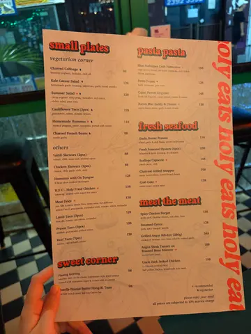 Just tried Holyeats in Central — such a cool spot! 😎 Loved the laid-back vibe and the food was seriously on point. We ordered:𐄁𐄙𐄁𐄙𐄁𐄙𐄁𐄙𐄁𐄙𐄁𐄙𐄁𐄙𐄁 ☰ ᴍᴇɴᴜ 𐄁𐄙𐄁𐄙𐄁𐄙𐄁𐄙𐄁𐄙𐄁𐄙𐄁𐄙𐄁👅•𝗛𝘂𝗺𝗺𝘂𝘀 𝘄𝗶𝘁𝗵 𝗢𝘅 𝗧𝗼𝗻𝗴𝘂𝗲• $𝟭𝟭𝟴First time trying this combo and it totally worked! Rich and tasty🧡🦀•𝗖𝗿𝗮𝗯 𝗖𝗮𝗸𝗲• $𝟭𝟯𝟴One generous piece, super crispy outside and packed with meaty flavour (not mushy at all, amazing!)🥗•𝗦𝘂𝗺𝗺𝗲𝗿 𝗦𝗮𝗹𝗮𝗱• $𝟭𝟮𝟴So refreshing with citrus yoghurt, snap peas, cucumber and pine nuts.🍝•𝗣𝗲𝘀𝘁𝗼 𝗣𝗲𝗻𝗻𝗲• $𝟭𝟮𝟴So cheesy and full of flavour, loved it✨🌮•𝗕𝗲𝗲𝗳 𝗧𝗮𝗰𝗼• $𝟭𝟮𝟴🐑•𝗟𝗮𝗺𝗯 𝗦𝗸𝗲𝘄𝗲𝗿𝘀• $𝟵𝟴Overall - Great place for a chill meal with good food and good vibes 🙌⋆ ⋆ ⋆ ⋆ ⋆🐽 Overall : 8.5/10🐽 Revisit : Worth a try…查看更多