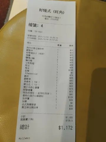今晚同朋友仔去到旺角好烧式食晚饭,油麻地A1出口行2分钟就到都几方便。今晚大家都每人写自己想食既,写左以下食物:蒜蓉烧茄子(原条),菠萝,盐烧白鳝,西班牙黑毛猪肋串,鸡肾串,马友鱼,阴公猪,七味鱼翅,枝豆,多春鱼,翠玉瓜,烧日本甜心蕃薯,蒜蓉烧蚝,特色蒜蓉包,香蒜白酒沙白扁意粉,鸡皮,Sapporo,加多宝。蒜蓉烧茄子(原条):蒜蓉烧茄子系非常之夹,茄子清甜蒜蓉香味融入当中。菠萝:菠萝烧得香口又多菠萝汁。盐烧白鳝:即烧即食鳝厚身口感好好,又充满鳝香味。西班牙黑毛猪肋串:黑毛猪肋肉质好味道佳。鸡肾串:鸡肾口感好。马友鱼:马友鱼大大条,烧得时间刚刚好,唔会过熟,肉质好够鲜甜,连个鱼皮都系脆而不㶶。阴公猪:泰式口味,猪肉肉质好味道够入面。七味鱼翅:够香口,有少少辣配合啤酒一流。枝豆:咸咸地 边食边饮下啤酒简直一流。多春鱼:烧得时间刚刚好,又唔会过干过㶶。翠玉瓜:外面烧好,入面个汁就锁住,清甜好味道。烧日本甜心蕃薯:蕃薯够晒甜,烧脆个表面更加香口。蒜蓉烧蚝:蒜蓉辣椒加入蚝中烧令到蚝鲜味提鲜不少。刚刚烧起既蚝热到飞起。特色蒜蓉包:整个大大蒜头原只烧够香口,蒜蓉包烧到香脆又有埋蒜蓉入味又唔会太干。香蒜白酒沙白扁意粉:沙白大大只冇沙够鲜味,香蒜白酒在煮完后挥发完都仲融入扁意粉中。鸡皮:隐藏系列,香脆又够薄没有多余既脂肪油腻感。Sapporo:原来今期做紧推广,买一送一。够冻先至好饮,同埋泡既比例都几好。加多宝:清热之选,烧烤加配。食完野意犹未尽仲整两个甜品去满足埋个甜品胃。黑芝麻豆腐奶冻:黑芝麻够香浓,而个豆腐奶冻个豆味都几香又够滑。法式焦糖炖蛋:焦糖脆口,炖蛋蛋味香浓。同店员倾开先知原来宵夜时段营业到凌晨3点,咁下次宵夜又多一个好选择了。…查看更多