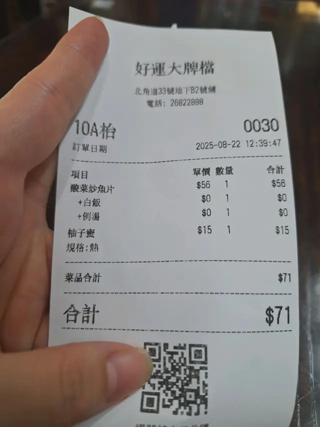 北角好運大排檔係25年老店,主打地道川菜,同時提供煲仔、小炒、鐵板、椒鹽、麻辣地鍋、沙鍋泡粥、湯品、五谷主食、素菜、小食及飲品,選擇非常多元化,適合一家大小或朋友聚餐。藤椒酸菜魚鱸魚:招牌菜之一,魚肉嫩滑,酸菜爽口,藤椒香麻不嗆喉,湯底酸辣開胃,每日新鮮熬製魚骨湯,絕無坊間預製醬料或湯包,可以放心喝湯。上湯小雲吞:皮薄餡靚,湯底清甜,暖胃又滋味,非常合適作為前菜。四川擔擔麵:麻醬濃郁,辣油香口,麵條彈牙,辣得過癮,令人一試難忘。金銀蛋白菜:咸蛋和面皮蛋既蛋香滲入白菜,口感層次豐富。熱柚子蜜:酸甜適中,暖胃又解膩,特別適合配辣菜。凍檸檬茶:茶味濃郁,檸檬清香,冰涼消暑,解辣一流。總結,餐廳無論是味道、價錢或選擇都令人滿意,是一間值得回訪的川菜好去處。…查看更多