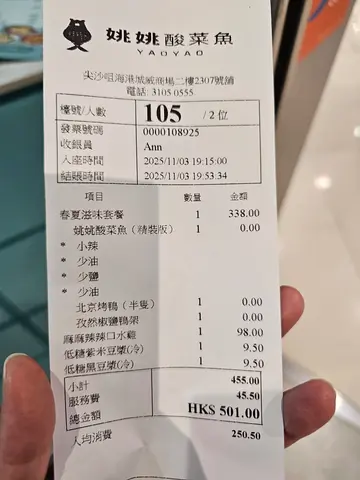 今晚嚟到我最爱嘅姚姚酸菜鱼,久未重逢嘅味道,以前食过觉得酸辣口味比市面上嘅酸菜鱼更出色,可以客制酸度、辣度、油量,有得拣先系Boss😎滋味共享套餐 滋味共享套餐$438超值共享,适合2-3人食,内里姚姚招牌酸菜鱼、北京烤鸭、孜然椒盐鸭架同凉菜酸辣土豆丝,川菜风味层次分明,从酸辣开胃嘅凉菜到主菜,好啱朋友聚会,份量足够一餐满足,性价比高到爆,食完觉得值回票价!🥔 凉菜 酸辣土豆丝 凉菜酸辣土豆丝清脆开胃,土豆丝切细炸脆爽口,配红辣椒丝、蒜蓉同醋汁拌匀,酸辣微麻带香蒜味,土豆脆口解腻提神,开头一碟即刻刺激味蕾🙂↕️🐟 姚姚招牌酸菜鱼 姚姚招牌酸菜鱼系米芝林推介经典!用国家认证新鲜鲈鱼片厚实弹牙无刺,鱼肉嫩滑鲜甜无腥,配24天发酵水东芥菜酸爽开胃,汤底酸辣适中带麻香,配料如豆芽、酸萝卜同酸菜份量丰富,热辣辣上枱,每啖鱼片浸满汤汁超过瘾,开胃一流,辣度可选小辣啱香港人口味,绝对系套餐亮点🤩🦆 北京烤鸭 北京烤鸭半只脆皮香口!鸭皮烤到金黄酥脆油脂丰富但唔腻,配鸭肉薄片、薄饼、青瓜、葱丝同甜面酱卷埋食,脆皮咬落喀滋喀滋,肉质嫩滑带淡淡烟熏香,酱汁甜咸平衡解腻,半只够晒分享,传统北京味正宗,食完觉得高级又满足,好啱钟意鸭嘅你🤤🔥 孜然椒盐鸭架 孜然椒盐鸭架香辣惹味,鸭架用剩余鸭骨炸脆后炒,配孜然粒同椒盐调味,香气扑鼻带麻辣鲜香,鸭肉入味松软骨头易啃,孜然味浓郁开胃,椒盐脆脆解腻,份量大啖啖肉好过瘾,川味风格辣度适中,食落暖呼呼,完美利用鸭架唔浪费👍🏻…查看更多