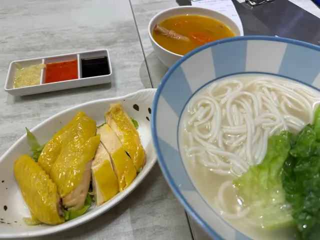 叫左個招牌海南雞米線(中)(+$3轉米線)($48)雞就一半胸一半髀位,佢係全熟,唔會仲有啲血水咁樣,同時肉質唔算好鞋,雞胸肉都食得落口,髀位就幾滑,啱我個人口味,但如果鍾意食嫩滑口感就會失望。食海南雞個汁都好重要,佢有薑油、辣醬同醬油,三隻都夠濃味!另外中size 雞同粉既份量都偏細,正常食量應該唔會飽。欣賞佢淥粉會加幾條生菜,都幾新鮮,仲送左碗好足料既蘋果雞腳湯,碗湯好好飲,仲滿滿湯渣,所以雖然個海南雞粉份量好細,有菜有湯成件事豐富左,加上整體味道正正常常,待應姐姐都好有禮貌,性價比還好。查看更多