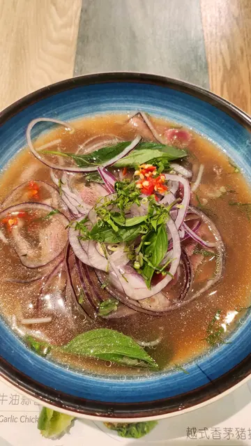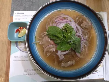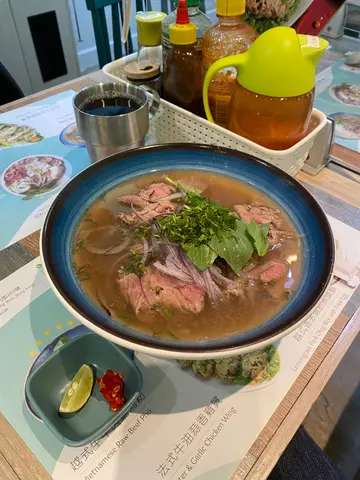 好耐冇食过越南嘢,知道尖咀孖宝上环开左分店,要黎帮衬下,铺头唔算大,有排单人位啱晒独L,下午茶时间人唔多,装修有花心思,越南尖帽做装饰,壁画几得意,隔牌贴左食物相,唔洗望住隔离奇怪食相之余又可吸引眼球,引起食欲(大前提要影得靓)午市套餐,包埋嘢饮,下午茶套餐有d 同午餐一样,问过份量一样,但系平d.饮品先到,可拎走纸杯装嘅青柠蕙米水,薏米好咬口,感觉有薏米健康咗,卖相相当不俗,配埋青柠辣椒,牛骨汤底清得黎好够味,加埋青柠辣椒仲正,幼河粉好滑,牛肉薄得黎好嫩,坚好食.薏米水饮到底先见到d 薏米.$60咁嘅质素,系抵食嘅.…查看更多