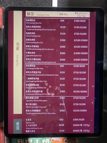 本地顶级茶叶品牌,由于曾获劳斯莱斯选用及订制茶叶礼盒,质素有保证,故有「茶中劳斯莱斯」之称。 提供即席手冲纯茶、茶叶、茶具以及纯茶意式雪糕,致力用味觉科学成果,提供「最好饮的中国茶」。 所有茶叶均由专家团队反覆测试,以严谨复杂的味觉科学方法挑选,确保干净无农药,层次复杂,香气多变,务求令茶客享受到中国茶叶中最顶级2%的滋味。 本店开业半年即获日本电视台节目『世界顶グルメ』邀请拍摄。