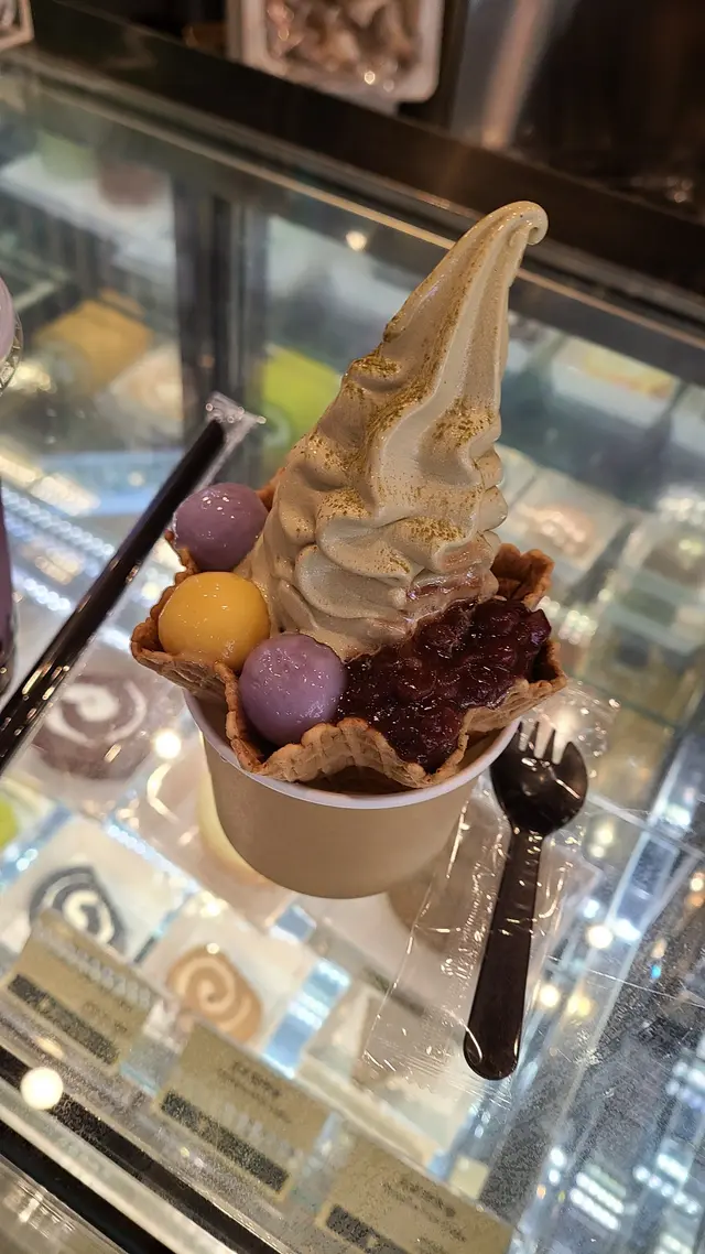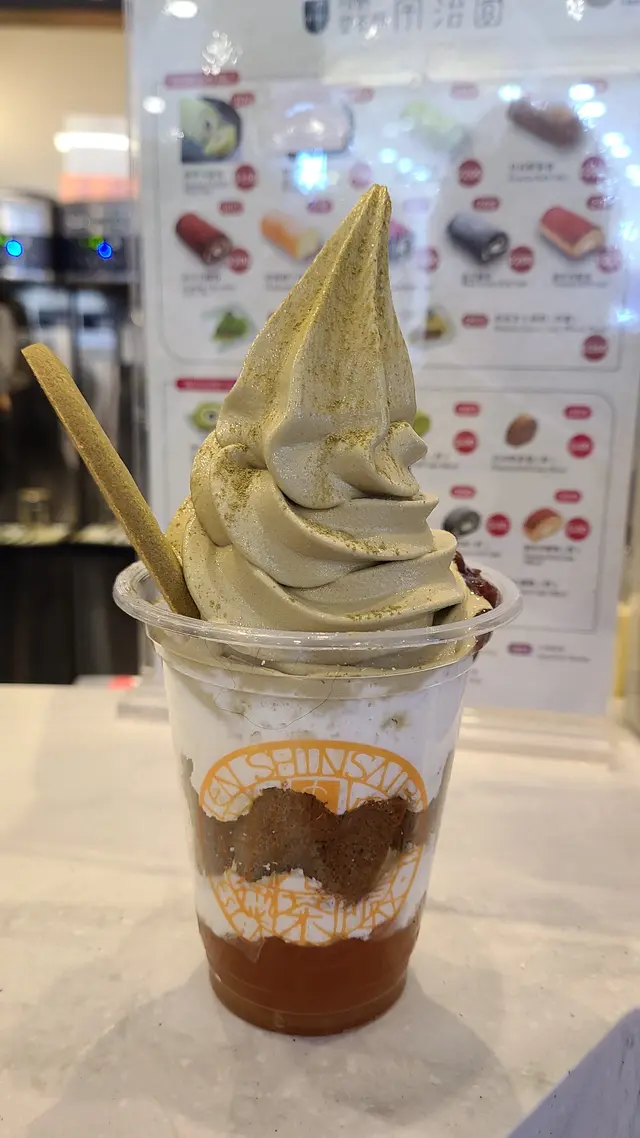 店名:宇治園地點:銅鑼灣時代廣場菜式:日式甜品雪糕餐牌:軟雪糕,軟雪糕甜點,沙冰,珍珠,奶蓋,咖啡,豆乳,凍飲,熱飲,同卷蛋。焙茶軟雪糕 $40食過呢間宇治園咁多次都係覺得軟雪糕最抵食,唔會有d多餘既忌廉或者唔好食既材料。軟雪糕有三款口味,首先要個焙茶先。軟雪糕好高身,要鬥快食,融得好快。焙茶味例牌香滑,好味。個窩夫餅都脆同好味道。牛奶軟雪糕 $40小朋友鍾意試試牛奶味,我就覺得味道較淡,可能係食左焙茶既原因。焙茶彩色丸子脆脆杯 $70脆脆杯其實係窩夫餅裝住焙茶軟雪糕,面頭灑上焙茶粉,伴有紅豆蓉同4粒丸子,兩紫一黃一白。窩夫餅夠厚同脆,都好好味。丸子我覺得唔夠煙韌,又無味。反而紅豆蓉配雪糕更好食,所以呢杯係好食過軟雪糕既,不過貴$30!紫薯黑糖珍珠 $50紫薯味較淡,同埋較稀。黑糖珍珠細細粒,煙韌度可以高d,份量都可以。呢杯飲品麻麻地。焙茶雪糕同窩夫餅係好食,飲品都係麻麻地。而家做緊買$100減$20優惠,就好抵!查看更多