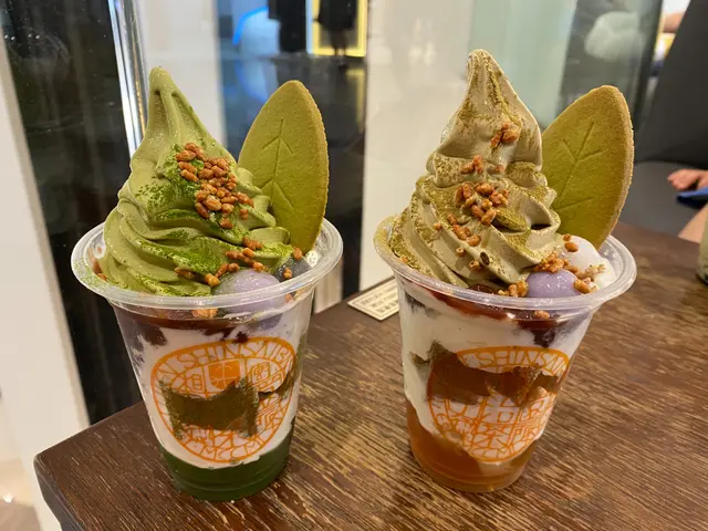 週日下午茶去咗宇治園食雪糕。宇治園餐牌有軟雪糕,軟雪糕甜點,沙冰,珍珠,奶蓋,咖啡,豆乳,凍飲,熱飲,同卷蛋。焙茶芭菲 $80芭菲一共有三款口味,包括抹茶,焙茶,牛奶。即叫即整。焙茶芭菲有焙茶軟雪糕,上面加左焙茶粉,插上一塊樹葉型曲奇餅,旁邊加左一綠一紫兩粒丸子同少少紅豆蓉,下面有大量忌廉,卷蛋蛋糕細塊同粟米片,最下底有焙茶味啫喱。芭菲杯口感豐富,首先焙茶軟雪糕係堅好食,又滑又香。曲奇餅又香脆又鬆化。粟米片好脆。焙茶味啫喱好滑溜,不過淡淡既焙茶味,就完全比雪糕既濃厚茶味比下去。丸子質素就麻麻地。卷蛋可以不過個人唔太鍾意忌廉。雖然宇治園應該想將卷蛋加入杯芭菲杯,不過如果係雪糕會好過忌廉。焙茶彩色丸子脆脆杯 $70第一次試呢度既脆脆杯,其實係窩夫餅裝住焙茶軟雪糕,面頭灑上焙茶粉,伴有紅豆蓉同4粒唔同顏色既丸子。呢個甜品就無多餘既忌廉啦。窩夫餅夠厚同脆,都好好味。反而呢度d丸子真係麻麻地,唔同顏色味道都一樣。紅豆蓉都甜,一定要配雪糕食。呢個價錢個人覺得貴。all of us shared both desserts.焙茶雪糕係好食,不過其他配料有好有唔好,呢個價錢就性價比勉强可以啦,下次唔好再食丸子。外賣完自己喺店舖隔離揾商場嘅位坐。查看更多