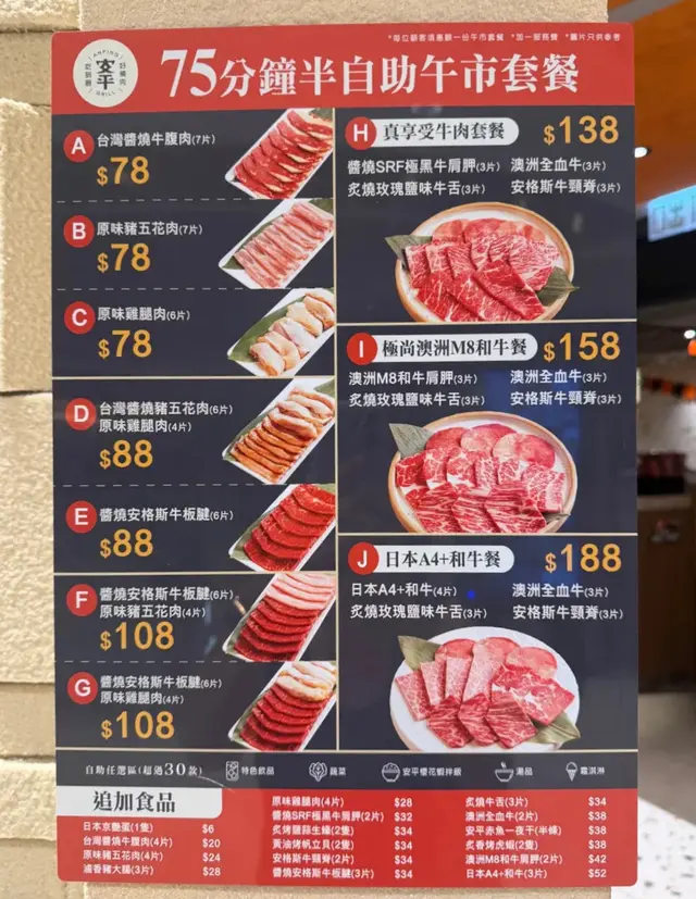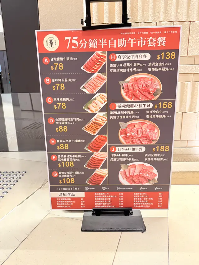 平時周邊都係日式燒肉韓式燒肉居多,今次試吓比較特別嘅台式燒肉,半自助放題形式,主打高質肉類配自助區,性價比真係唔錯,值得推介!午市半自助放題都有成十個餐選擇,揀選自己鍾意食嘅套餐肉類。今次我就揀咗極尚澳洲M8和牛套餐,套餐包括四款高質精選和牛肉品,每款有三片,肉質出色。極尚澳洲M8和牛套餐:澳洲M8和牛肩胛+炙燒玫瑰鹽味牛舌+澳洲全血牛+安格斯牛頸脊每款肉都可以自己燒,掌握火候好有滿足感。食物種類多,仲可以追加其他食品。除咗定食肉類主食外,自助區仲有超過30款食品和飲品任君選擇,選擇多元化,亦都好有驚喜。食之前梗係要到醬汁區揀選鍾意嘅醬汁,全部都係台式醬汁嚟㗎 !超多款醬汁自由配搭,仲有好多好特別嘅醬汁選擇,如招牌黃金醬、薑味可樂醬、香水檸檬汁、海鮮五味醬、香辣烤肉辣椒粉、蒜味鹽醬、安平辣椒醬、泰式海鮮醬、椒麻口水醬、柚子醬、鹽蔥醬等等,好多都係第一次聽,尤其是食花枝餅,一定要點台式甜辣醬,呢度真係做到足!自助區有不同嘅燒烤配料配菜、台式滷味、沙律、安平蝦拌飯、湯品、甜品、水果、各式各樣茶類飲品,仲可以點選台式奶茶、果汁等,如果唔飲凍飲,連熱冬瓜茶無糖綠茶都有啊!真係應有盡有,十足十地道台式風味!75分鐘午餐時間唔會太趕,適合午餐快閃或朋友聚餐。午市放題套餐抵食有水準,自助區選擇夠多,醬汁又有特色,午市都食得好滿足!…查看更多