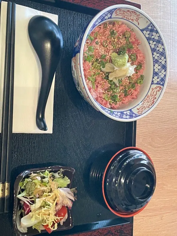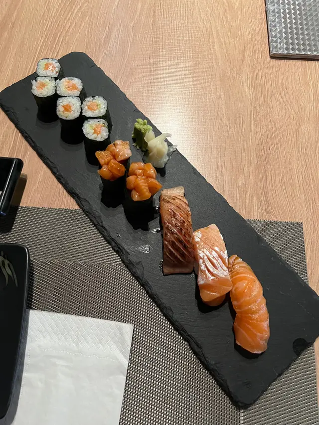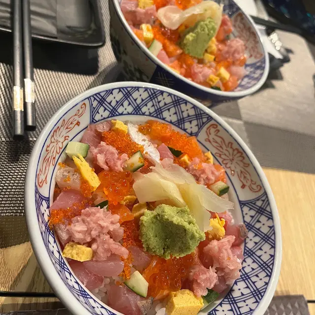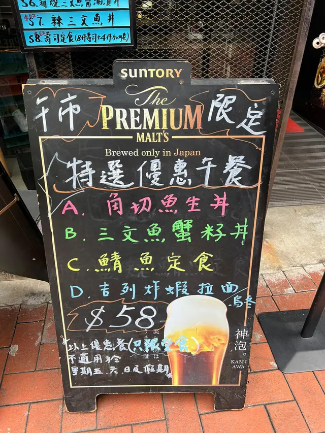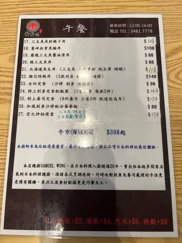 天氣熱到34度,相信好多人都會揀食刺身壽司,今日特登搭車過嚟,因為見到都有唔少好評,而且見佢午市套餐有做刺身丼飯,價錢合理啦,入到去空間都合理嘅,不過師傅服務員唔係好識點樣安排客人入座,反而要我提議唔介意搭枱,佢先至將一個近廁所嘅四座位分開兩個座位,其實都係好小事,同樣服務員係唔識得攞茶俾客人嘅,又唔見得呢一間店屬於自助形式,都唔緊要,期望食物好食啲啦,揀咗一個午市餐牌嘅148廚師發辦嘅壽司當飯,廚師發辦理應會揀合適嘅刺身放埋一齊,如果要熱嘢飲就加兩蚊,OK啦total$150, 上枱嘅時候就如圖,大大隻牡丹蝦確實吸引,不過竟然係有沙嘅,港督海膽都預咗佢唔會好多,不過識落都鮮甜嘅,其他嘅刺身魚各一塊啦,唔會話特別大塊,我諗我坐喺嗰度都等咗30至40分鐘,雖然我唔趕時間,但係服務員都知道我坐咗喺度好耐,食到一半嘅時候,服務員話唔記得咗攞沙律,其實都係啲菜碎淋啲汁… 總括嚟講一般般,唔係特別好食…查看更多