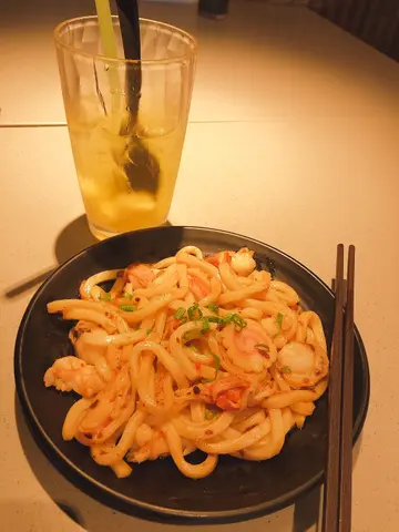 分享返早前行过悦来坊食过嘅平价下午茶🌞当日系平日,餐厅内已经系得一两个食客😣搜寻之下先发觉荃湾呢间已经系唯一一间定食8🔍 💭日式海皇酱炒乌冬($38)睇起嚟好似唔系好大碟,但系乌冬都好饱肚架🍲食得出佢系落左好多XO酱,真系有啲辣♨️但系胜在惹味得黎又几抵食💁🏻‍♀️ 加3蚊有冻饮🥤菠萝特饮味道正常🍍可以解下辣都唔错Read More