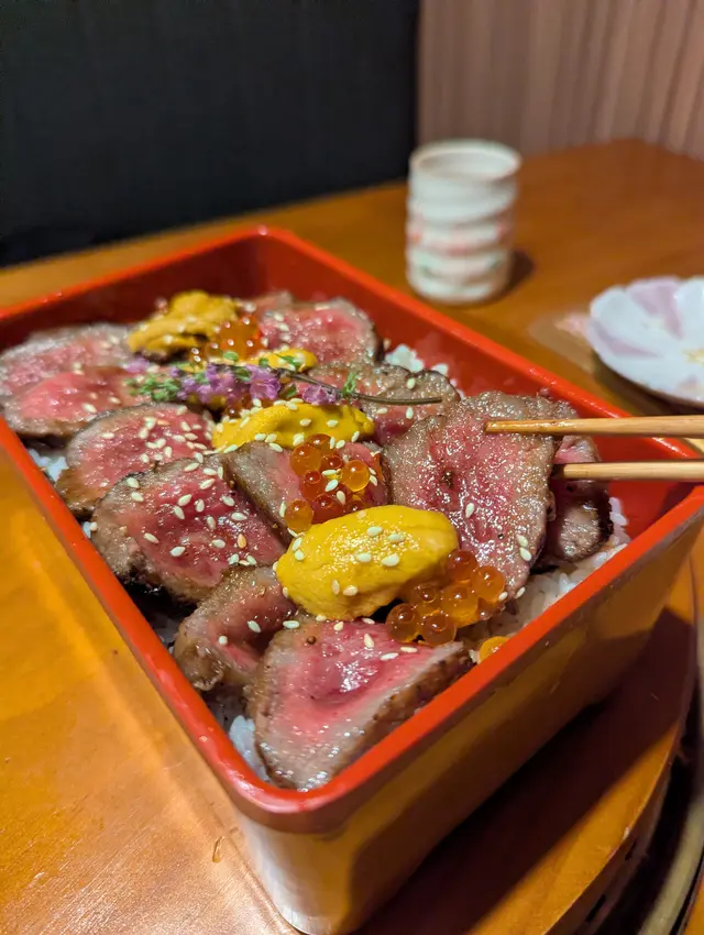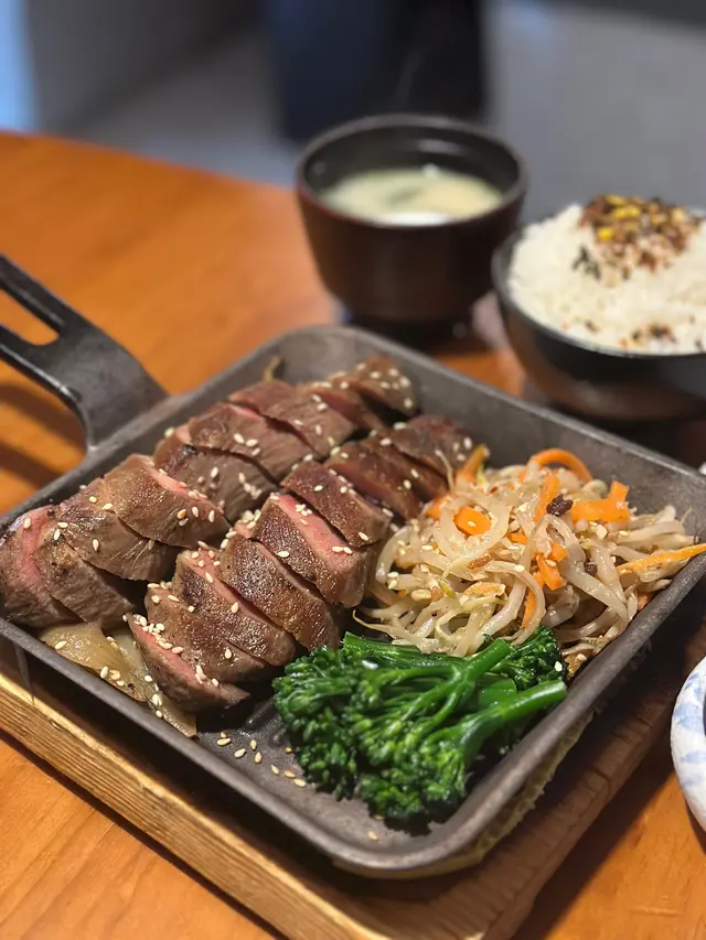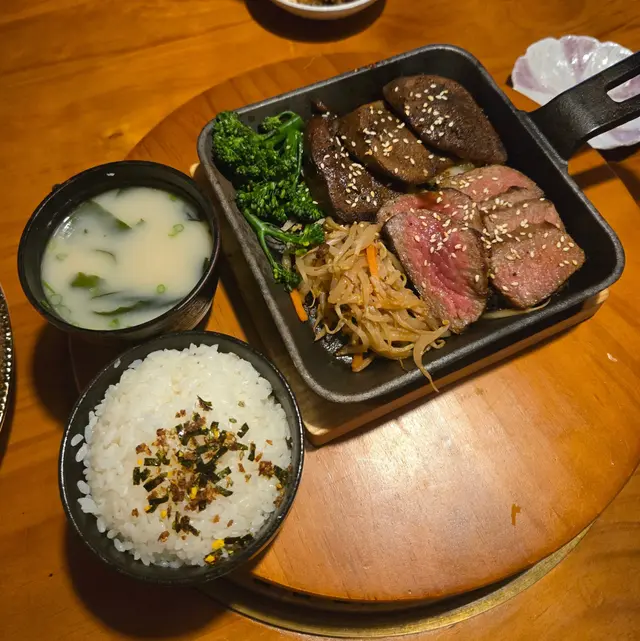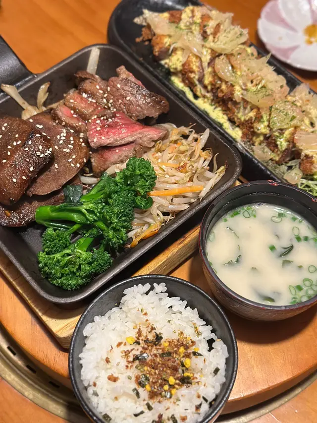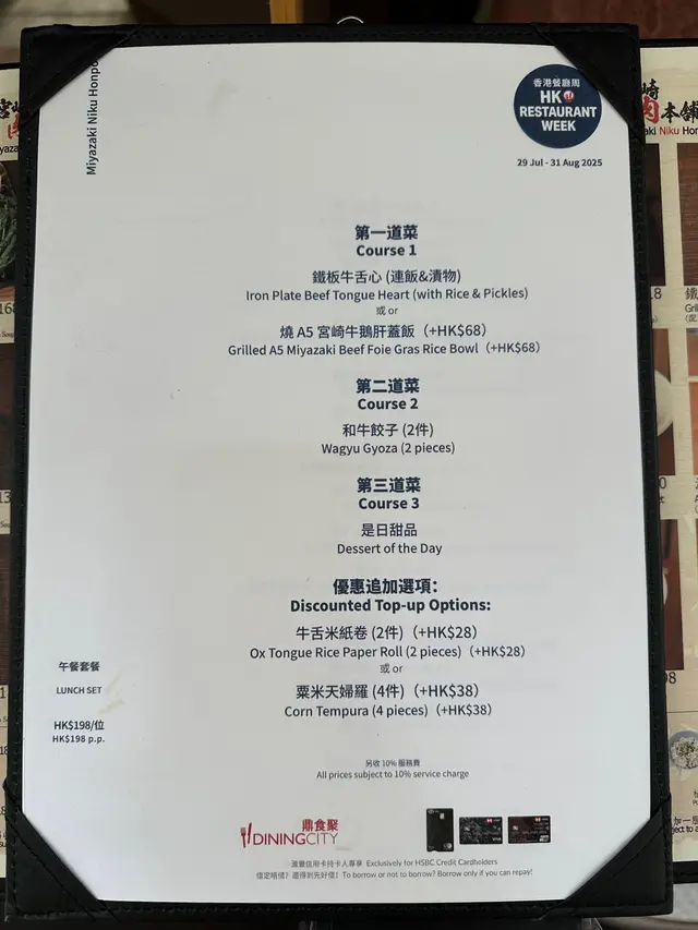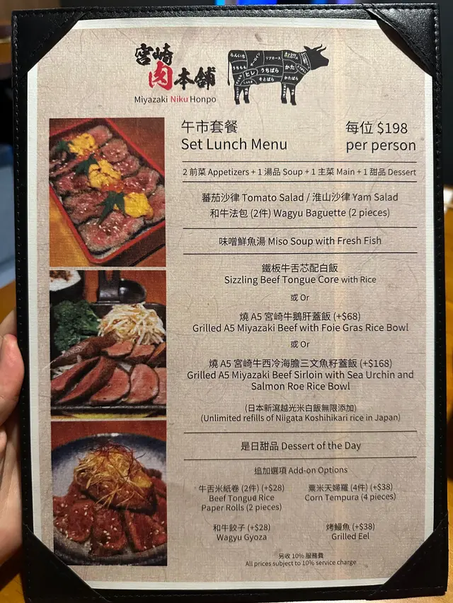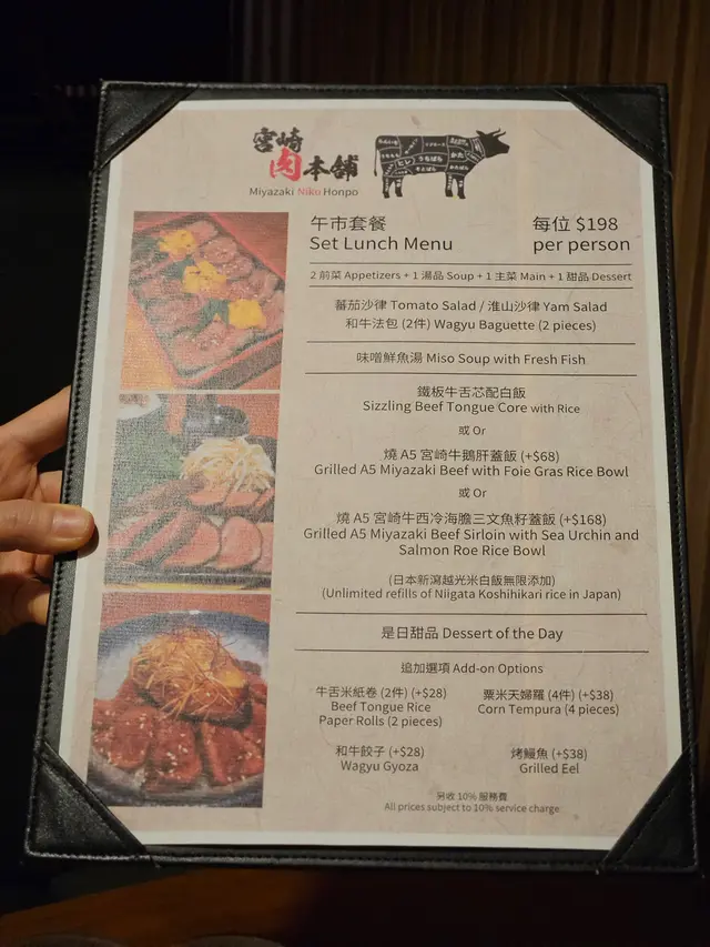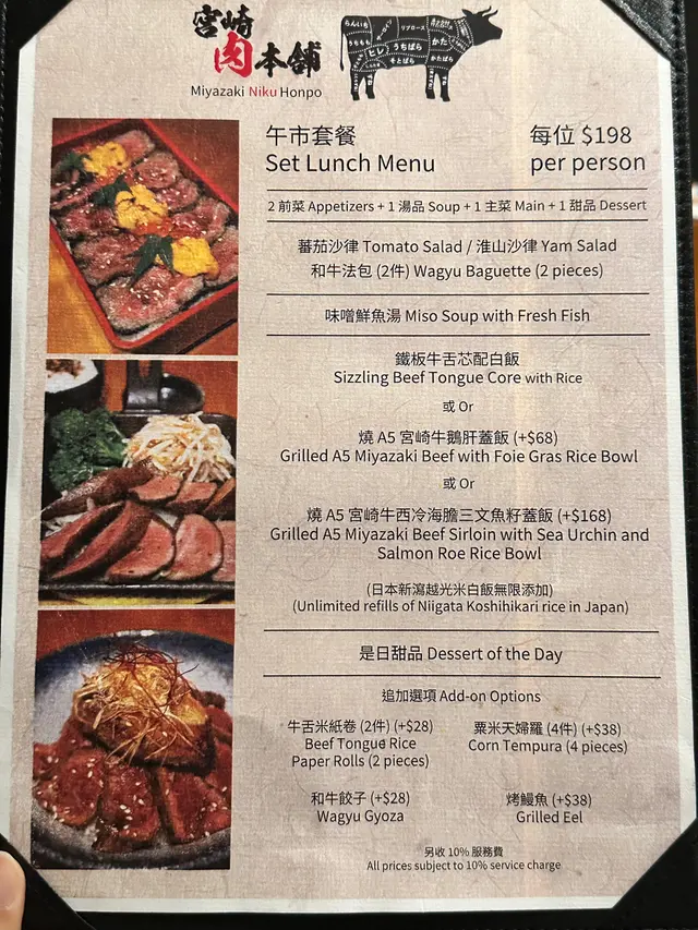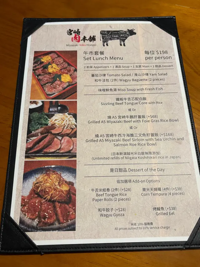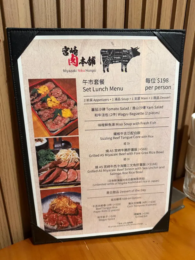 同事farewell, lunch去咗天后嘅宮崎肉本舖, 午市推出多款LUNCH SET, 款款吸引, 對於請客黎講絕對唔失禮, 而且質素仲超水準。餐廳座位以卡位為主, 坐得舒服。SET LUNCH $198起, 包括有前菜、湯、菜同甜品, 更可額外追加小食。蕃茄沙律: 蕃茄已被去皮, 蕃茄清甜兼配上酸汁, 酸尾尾好開胃。准山沙律: 質感好似薯蓉, 有蟹肉做點駁。和牛法包: 法包非常香脆, 牛肉碎粒很有肉香, 整件入口既香脆又帶有油香。味噌鮮魚湯: 魚鮮味十足, 超正!鐵板牛舌芯配白飯:鐵板熱辣辣滋滋聲上檯, 牛舌芯份量足, 而且厚切。中心位keep到少少嫩紅, 牛舌芯爽彈軟嫩又帶有脂香味, 唔洗點汁食已經好正!A5牛西冷海膽蓋飯:A5牛西冷平佈盡顯份量, 將整個飯完全覆蓋, A5牛西冷牛脂分佈平均, 口感軟嫩冇筋, 配有甘甜入口即溶海膽同埋三文魚籽, 令整體味道更提鮮、更有層次。另外仲追加兩款小食:烤鰻魚: 絕對可以用皮脆肉嫩形容, 表面烤得金黃, 沒有加太多鰻魚汁, 但能食到鰻魚獨有香氣。粟米天婦羅: 炸得鬆脆不油, 粟米之間分內緊密, 香甜多汁。最後送上甜品---雪糕糯米糍, 非常滿足!…查看更多