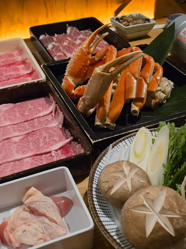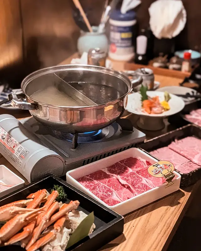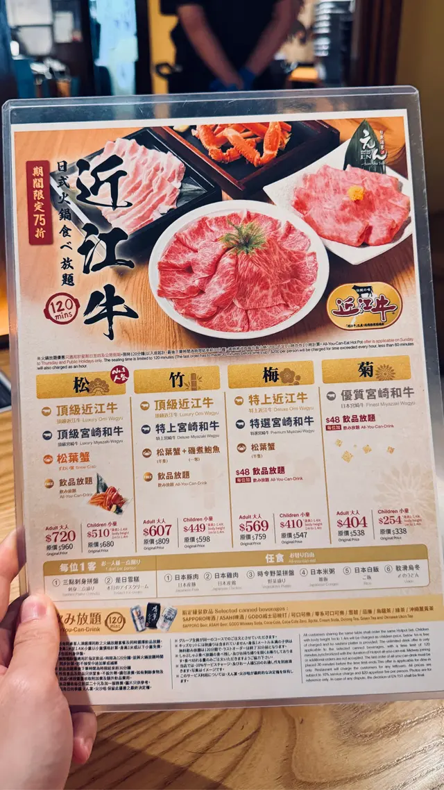 先介紹優惠:這晚到來試試"近江牛x宮崎牛、松葉蟹放題"。火鍋放題每日10時後7折,星期日至四10時前75折🫶🏻選擇了"松"火鍋放題,近江和牛、宮崎和牛、松葉蟹、日本豚肉、日本雞肉等及飲品都可任食任飲。此外,每位附送三點刺身拼盤及雪糕。凡惠顧日式火鍋放題"松"或"竹",可以免費飲み放題,任飲罐裝Sapporo啤酒、Asahi啤酒或GODO Highball等。另外每晚10時後有深宵割引優惠:食物方面可從10款選其中兩款,包燒鱈魚片、螢光魷魚漬、水雲醋物、厚炸沖繩島豆腐、酒盜芝士、雞肉大葉串燒伴梅子醬、自家製雞肉棒、炸沖繩魷魚鬚等。當中特別推介雞肉大葉串燒伴梅子醬,份量多又烤得超級美味,兩串只需$49。食物以外,還有酒精飲品的深宵割引,可5選2,包括三得利頂級生啤酒、三得利角瓶威士忌梳打、黑霧島・芋焼酎、くら (古酒 25度)、瑞穂梅美人 介紹"松"火鍋放題:套餐中任食的近江牛來自日本歷史最悠久的和牛產地滋賀縣,擁有超過400年飼育傳統,被譽為「日本三大和牛」之一,是皇室貢品。肉質柔軟,霜降紋理細緻均勻。另一任食的宮崎牛,店家採用榮獲4屆「日本一」的特上宮崎和牛,肉香濃郁、口感細膩。松葉蟹肉質細緻、柔嫩,入口鮮甜,帶有淡淡的海水鹹香,完成一碟後可請侍應幫忙追加,也是任食的。…查看更多