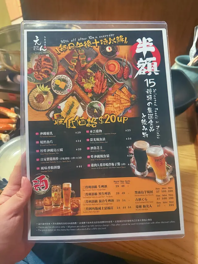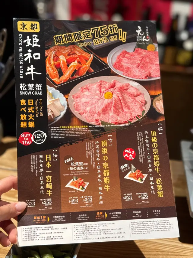 位於尖沙咀的「En宴」主打日式火鍋放題,以其高品質的食材以及暢快的飲品,而吸引不少客人前來。餐廳位於商廈一樓,裝修是日式居酒屋的風格,配上日本的沖繩元素的海報、設有榻榻米。擁有輕鬆、熱鬧的用餐氛圍。招牌 近江牛120分鐘火鍋放題 (松套餐)·奢華肉品:頂級的近江牛(日本三大和牛),肉質柔軟,霜降均勻。和宮崎和牛(4屆榮獲「日本一」殊榮的特上宮崎和牛),肉香濃郁,在鍋中輕涮幾下,入口即化。同時,松葉蟹也是放題亮點之一,鮮甜的蟹肉無限量供應,能滿足所有海鮮愛好者的味蕾。·完整的套餐體驗:除了無限量添加的肉類和蟹,套餐還包含三點刺身拼盤。而用餐後,提供清爽的柚子和濃郁的綠茶雪糕,能完美化解之前的油膩感,口味濃郁,口感輕盈。·豐富的配套選擇:菜單上還有日本豚肉、雞肉、時令野菜拼盤等多種涮品,還加了鬆脆的厚炸沖繩豆腐和汁燒自家製雞肉棒。·暢快飲品與用餐氛圍除了美食,飲品放題同樣令人驚喜,提供了多樣化的選擇來搭配火鍋。指定罐裝飲品包括:SAPPORO啤酒、ASAHI啤酒等,更有沖繩黃薑茶等解膩茶可以飲。聽店員說他們還推出日式火鍋放題每日10點後7折,星期日至四10點前75折/每晚10點後仲有深宵割引,10款指定菜式以及5款酒精飲品一律半價。等多元化優惠來吸引喜歡食放題的客人。…查看更多