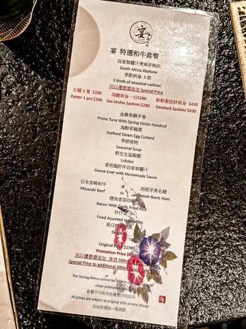 汁煮南非鲍鱼汁煮南非鲍鱼的味道极为鲜美,鲍鱼肉质紧实,口感滑嫩,弹性十足,鲍鱼在酱汁中慢慢煮熟,吸收了酱汁的精华后,散发出浓郁的海味与鲜香,带有微微的甜味季节刺身三款刺身肉质厚实,油脂分布均匀,入口即化,肉质细腻,味道清淡而鲜美,带有淡淡的甜味金枪鱼腩手卷新鲜的金枪鱼腩肉质滑嫩,带有丰富的油脂,入口时弹性十足,散发出浓郁的海鲜鲜香,搭配的米饭柔软黏稠,手卷外层包裹的海苔脆口,增加了口感的层次感海鲜茶碗蒸鲜嫩的鸡蛋液经过蒸煮,呈现出丝滑的质地,入口时如丝般柔滑,搭配的海鲜,释放出浓郁的海味,充满鲜香,汤底的高汤熬制而成,带有淡淡的鲜甜,与鸡蛋的香气相互融合,海鲜的鲜美与鸡蛋的嫩滑,茶碗蒸不仅滋味鲜铁板烧龙虾新鲜的龙虾肉质鲜甜,外层微微焦脆,内里却保持著多汁的口感,用上龙虾膏和牛油做酱汁,入口非常香的龙虾高味道,龙虾的鲜甜更为突出香煎鹅肝半自家制酱汁香煎鹅肝的外层金黄酥脆,内里则柔软滑嫩,入口即化,带有浓厚的奶香与独特的脂肪味,每一口都能感受到鹅肝的丰富层次,微微的咸味与甜味西班牙黑毛猪西班牙黑毛猪的味道极为丰富,猪肉肉质细腻,脂肪分布均匀,肉质鲜嫩多汁,入口即化,带有微微的坚果香气烟肉香蒜炒饭烟肉经过煎炒后,散发出浓郁的烟熏香气,与炒饭的米粒相互融合,香蒜的加入,令味道更加鲜明,炒饭的米粒松散,吸收了烟肉的油脂与香味,口感滑顺而不油腻炒杂菜炒杂菜的味道清新,蔬菜的鲜甜,经过热炒后,保留了脆嫩的口感…查看更多
