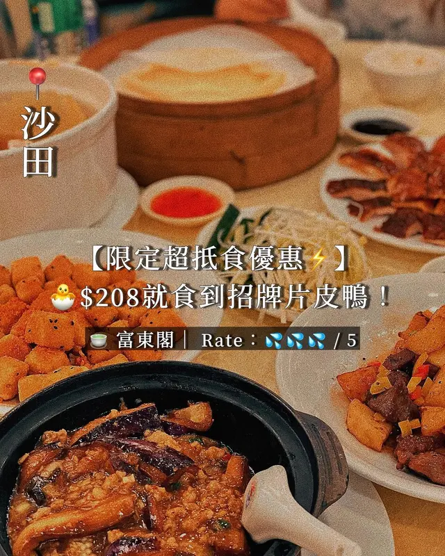 以前讀書偶爾都會嚟食,最近朋友話想食小菜,🌟つ•̀ω•́)つ即刻就諗到佢!富東閣係片皮鴨關注組都算赫赫有名💥,近期做緊限定超值優惠價,我哋就叫咗片皮鴨夏日二重奏同埋三餸小菜套餐,整體味道尚可,勝在CP值夠高✅!🧚🏻‍♀️~~~~~~~~~~~~~~~~~~~~~~~~🧚🏻‍♀️🔸招牌扁皮鴨|嬤嬤皮|青瓜絲|醬料片皮鴨厚肉油脂少,🦆鴨肉味濃但唔帶羶味,肉質亦唔會乾柴。不過鴨皮略嫌腍身,感覺比以前退步咗😢但勝在cp值高,份量絕對足夠,最後我地甚至淨咗一堆扁皮鴨無嬤嬤皮包😂 (btw嬤嬤皮之間有蒸籠紙隔開👍🏻讚喔!🔸海皇冬瓜盅蟹柳|蝦仁|瑤柱絲|火腿茸|豬肉粒|草菇(≧∀≦)ゞ湯底清甜,非常足料。🧊飲落去極為消暑,食到好滿足啊!🔸黑椒牛柳粒牛柳粒火候掌握得比較好,😋肉質軟腍,薯仔亦明顯有炸過,外皮帶有少少脆身,🍯加上蜜糖調味,整體表現尚可!🔸椒鹽豆腐推薦大家一試!呢個小菜師傅做得相當有水準🤩!外皮炸粉非常香脆,包裹著滑嫩嘅豆腐,口感一流🫦!而且椒鹽份量控制得啱啱好,整體非常香口。🫵🏻推薦!🔹魚香茄子店員一鍋魚香茄子咁上台,香噴噴熱辣辣,夠嗮鑊氣🔥!非常惹味!可惜略嫌油咗少少🙈至於環境及服務方面,富東閣係一間舊式酒樓,所以大家唔好抱太大期望啦~🤪但空間尚算寬敞,店員態度亦唔錯。整體黎講,味道尚可,份量足夠,CP值高!大家不妨一試!🧚🏻‍♀️~~~~~~~~~~~~~~~~~~~~~~~~🧚🏻‍♀️如果你哋試過富東閣嘅食物,歡迎留言分享喔~ 多謝你哋嘅支持!💕😚✏️整體評分:3分💸人均消費:$100~$200📍地點:富東閣海鮮酒家 (沙田)沙田瀝源街6號瀝源廣場1樓5號舖查看更多