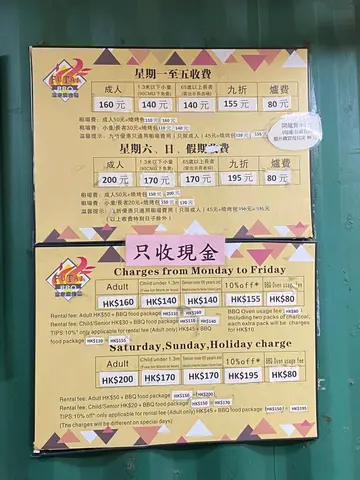 不设时限,任食烧烤场 星期一至五 : 成人$90/位、小童/长者$60/位;开炉费$30/炉 星期六、日、假期 : 成人$100/位、小童/长者$70/位;开炉费$30/炉