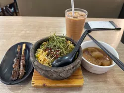 油塘富田和食亭嘅石锅拌饭套餐。石锅饭有海苔丝、葱花,旁边有两串烤肉串、一碗汤同冻奶茶,份量丰富。富田和食亭价钱合理,餐点种类多,但味道表现一般,整体系平价日式家常风味。🍚