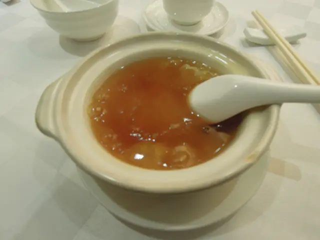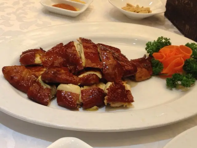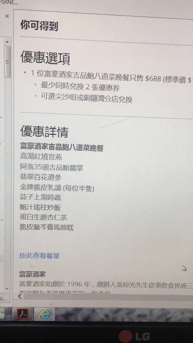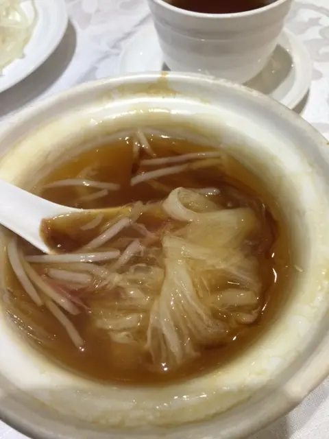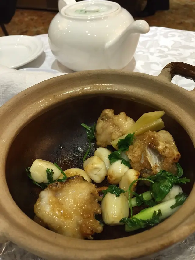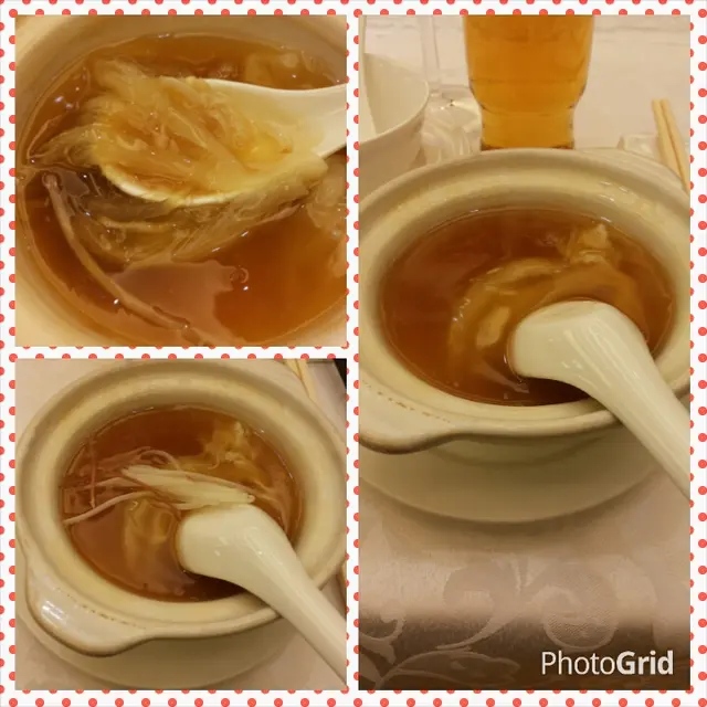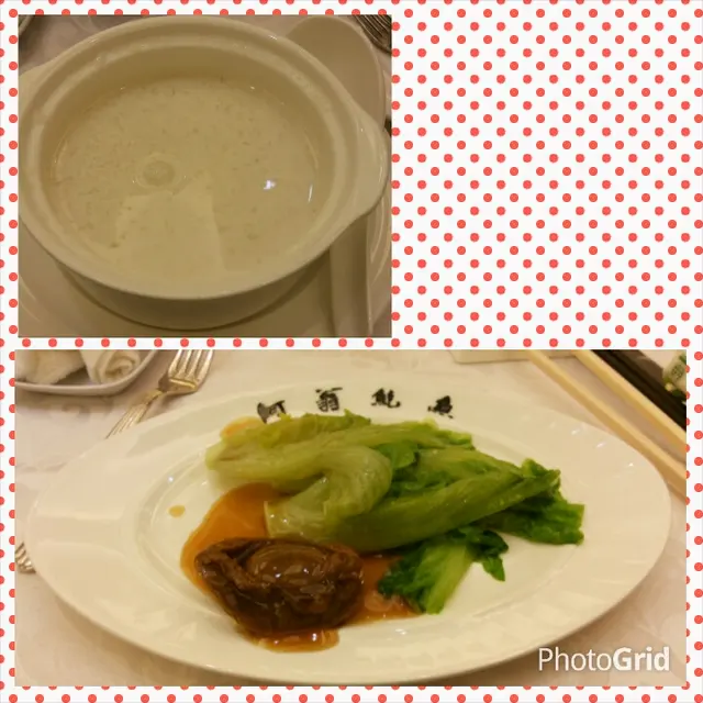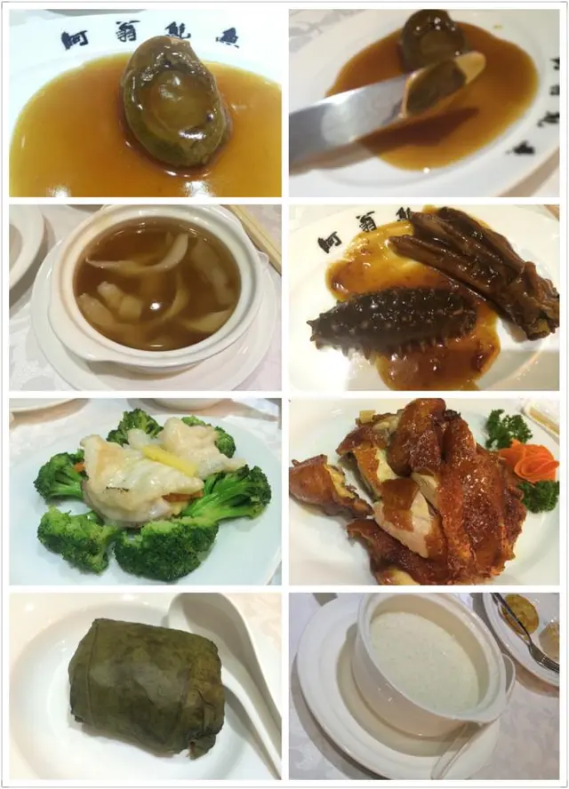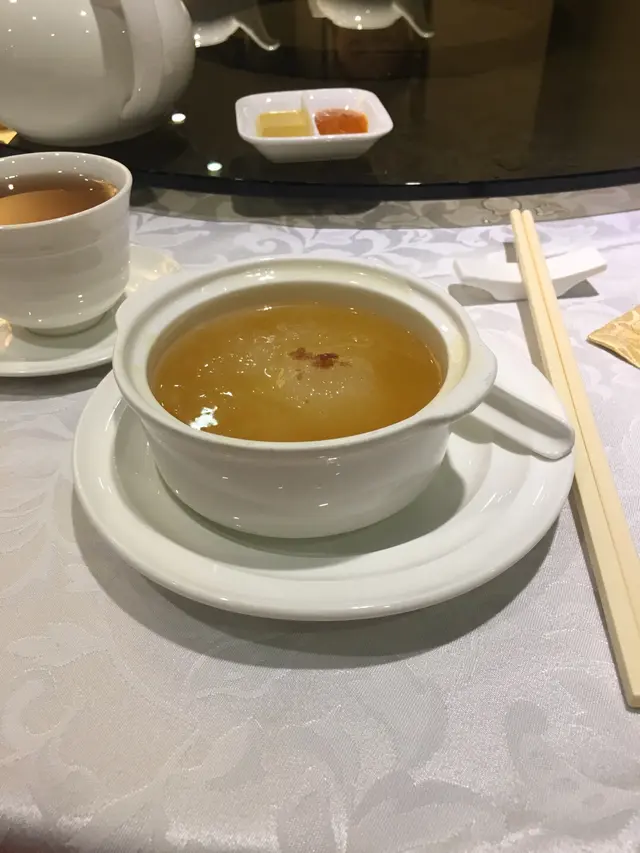 一行七人團購左這𥚃的八道菜晚餐。紅燒官燕,高湯香濃,燕窩不少,加了少少腿蓉,不錯。吉品鮑鵝掌,鮑魚黏刀有咬口,個汁調得濃度剛好,但鵝掌炆的時間不夠。百花遼參,蘭度爽口,蝦膠彈牙,個汁比較清。脆皮乳鴿半隻,炸得好香口,但冇乜肉。蒜子上湯莧菜,莧菜嫩口,個湯好清好好味。瑤柱炒飯,份量大,瑤柱也不少,炒得好乾身,好惹味。旦白杏仁茶,吾太甜,淡淡杏仁香。脆皮龜苓膏馬蹄條,細細條,一口一條,普普通通。整體來說是不錯,待應服務也不賴,但男仕可能不夠飽。…查看更多