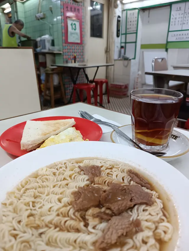 相信如非老街坊應該不會找得到 除非像我故事找 原因也是因為yt說要清拆 也有人說大件夾好食?機緣巧合今天到人生第一次的牛池灣考試找尋美食都說這間 應該有65年歷史的茶記中午時間人不太多在c1出口步行5分鐘不到點了一份最多人點的常餐$33也不貴 現今很多地方應該近或過$40吧沙嗲牛肉麵 麵比較少但可以加底 麵較淋很一般 應該是麵質不好這價我接受但份量少就。。。算了 不重要 為何能有4星?因為他牛肉不是鬆肉粉整淋 不是傳統茶記把牛肉浸在現成沙茶醬的又咸又淋的爛肉 這店牛肉有鮮味有口感 湯是牛肉湯加上一點點沙嗲汁吧 主要是牛味和咸味 但不口喝 所以很掂奄列和多士都一般 夾一起食還算可以因為句太薄烘得還可以 蛋也薄但沒過老可惜不嫩火腿是些少 這價錢我沒要求什麼了 對不咖啡是傳統絲襪咖啡撞不夠次數和時間所以味不夠濃一般人夠了 我習慣特濃才不滿足服務基乎沒有,每台客人都沒有給杯茶水 在香港這有點奇怪 所以都自己去倒茶喝,該都考街坊不會計較環境尚可 最少不迫 所以坐位在香港茶記這算舒服 有緣能來但不會專誠而來 真的不用…查看更多