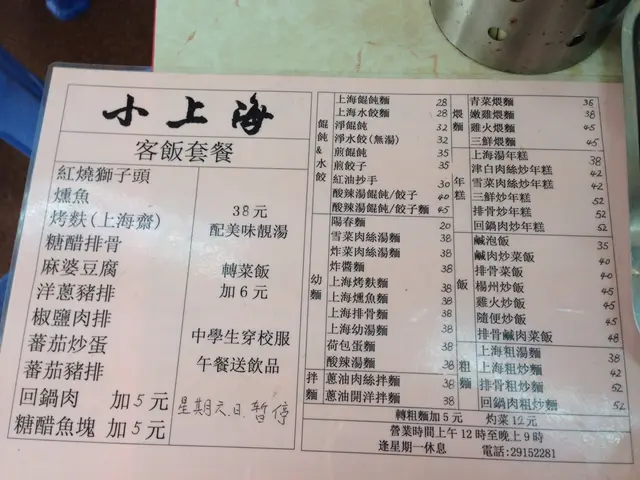 小上海 (西环) 网址: https://s.openrice.com/QrLS0uyq000 地址: 香港西環西營盤第一街119號 电话: +852 2915 2281