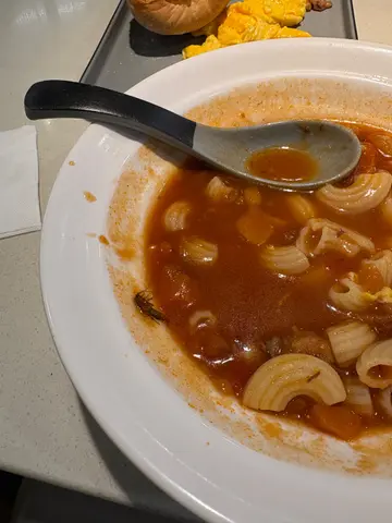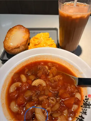 选择「招牌鲜茄牛骨汤通粉🍅🐮」,配炒滑蛋🥚和奶油猪仔包🐷,冻柠茶少冰🍋🧊。📌鲜茄牛骨汤即是罗宋汤,牛腩粒只有1粒,仲偏‘鞋口’,通粉唔够热,唔好吃。📌炒蛋炒过熟似块蛋皮,唔滑又唔够热。📌奶油猪仔包,唔热,但算脆口,炼奶和牛油涂得足够。📌冻柠茶,冇乜茶味,叫少冰但冰量仍然多,饮完仲有半杯冰。鏓括而言,这款餐只当填饱肚,质素有改善空间。