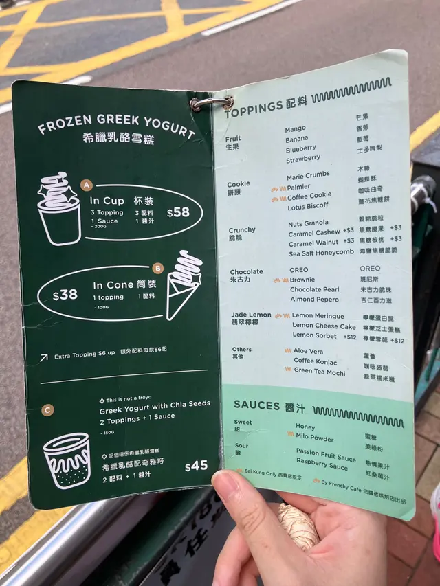 喺西貢行到有啲熱,想搵間餐廳坐低休息下,抬頭見到呢間有乳酪雪糕即刻衝入去試!:)舖頭空間唔大,室內只有企位,室外得一張長凳可以坐幾個人。不過天氣熱,有得食雪糕已經好開心~我揀咗杯裝乳酪雪糕,可以自選3款 toppings 同1款醬。揀咗海鹽焦糖脆脆、綠茶糯米糍、咖啡蒟蒻加熱情果醬。海鹽焦糖脆脆好好味