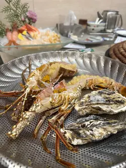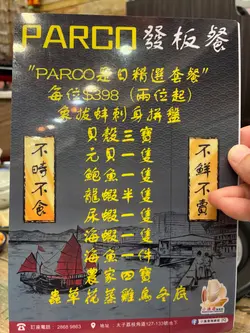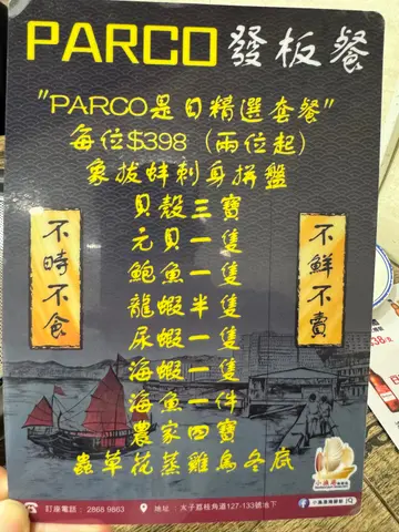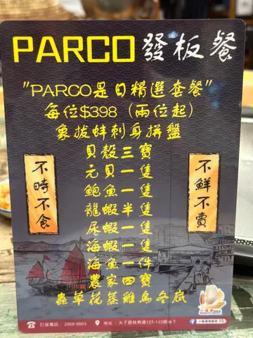 “不时不食” “不鲜不卖” 真系无呃人,当晚食嘅所有海鲜同蔬菜都好新鲜,有专人帮你计时蒸包蒸熟(唔计overcooked),不过环境就比较嘈,而且坐得迫夹,就算食物OK但我都唔会想再嚟。📝PARCO发板餐 $398==================🥢象拔蚌刺身拼盘⭐️⭐️⭐️⭐️象拔蚌、赤贝、带子、三文鱼、北寄贝、甜虾、希灵鱼,全部刺身都好食,最正都真系象拔蚌劲爽口。🥢贝壳三宝⭐️⭐️⭐️花甲、东风螺、蒸蚝都好好味,最正蒸蚝口感creamy。🥢元贝一只 + 海虾一只⭐️⭐️⭐️⭐️元贝唔韧蒸得好啱时间,海虾爽口弹牙。🥢鲍鱼一只 +海鱼一件⭐️⭐️⭐️⭐️鲍鱼口感软熟,海鱼有鱼味唔腥好正。🥢龙虾半只⭐️⭐️有少少膏但overcooked 而且肉有啲黏壳,嘥咗只龙虾!🥢濑尿虾一只⭐️⭐️⭐️⭐️⭐️成只手掌咁大只,鲜甜啖啖肉又有少少膏超好味。🥢农家四宝⭐️⭐️⭐️⭐️南瓜、粟米、紫薯、虾米胜瓜四样都够腍好新鲜。🥢虫草花蒸鸡乌冬底⭐️⭐️⭐️芋头好棉,鸡唔够滑,但鸡油落晒去垫底嘅乌冬度,挂汁好味! 五人共消费:$2404 …查看更多
