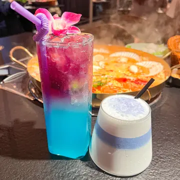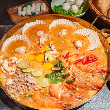 【铜锣湾•小火山】 🐝—————————————————————经常打边炉嘅我都系第一次食泰式火锅,餐厅除咗有火锅之外仲有烤肉。今次试咗餐厅新出嘅「泰大镬海鲜面」,由泰藉主厨处理,自家熬制冬阴功汤。🍯|泰大镬海鲜面|HKD 398配料相当充足:扇贝、沙白、海虾、鲜鱿鱼、猪肉等等。四只胀卜卜嘅蛋黄搅散后就可以与汤底享用。冬阴功汤酸辣口感地道正宗,饮了不少。泰大镬似韩式部队锅,大量配料配上海鲜面,非常饱肚。除此之外,餐厅建议我哋可以加入不同食材享用,就像火锅一样。🍯|竹笙虾滑|HKD 52平时酸辣汤底粉面都会叫竹笙,因为相当入味,轴心配虾滑都系第一次食,口感弹牙又多汁。。🍯|美国极级牛板键|HKD 88火锅离不开牛肉,牛板键味道浓郁,火锅一流。🍯|手打流心咸蛋黄墨鱼丸|HKD 58丸类最喜欢手打,因为够弹牙,流心咸蛋黄够晒邪恶。🍹|火山青柠蓝泡泡|HKD 58蝶豆花青柠汁,适合解辣解油腻。。🍹|火山蓝牛奶|HKD 38外貌吸睛,友人表示好味。餐厅费用包括虾片任食及酱料区|HKD 28/位推介虾片😍新鲜即炸,配上秘制酱汁,食唔停口。。仲要介绍餐厅有live Band show,不过当日未能欣赏,希望下次可以看到。…查看更多
